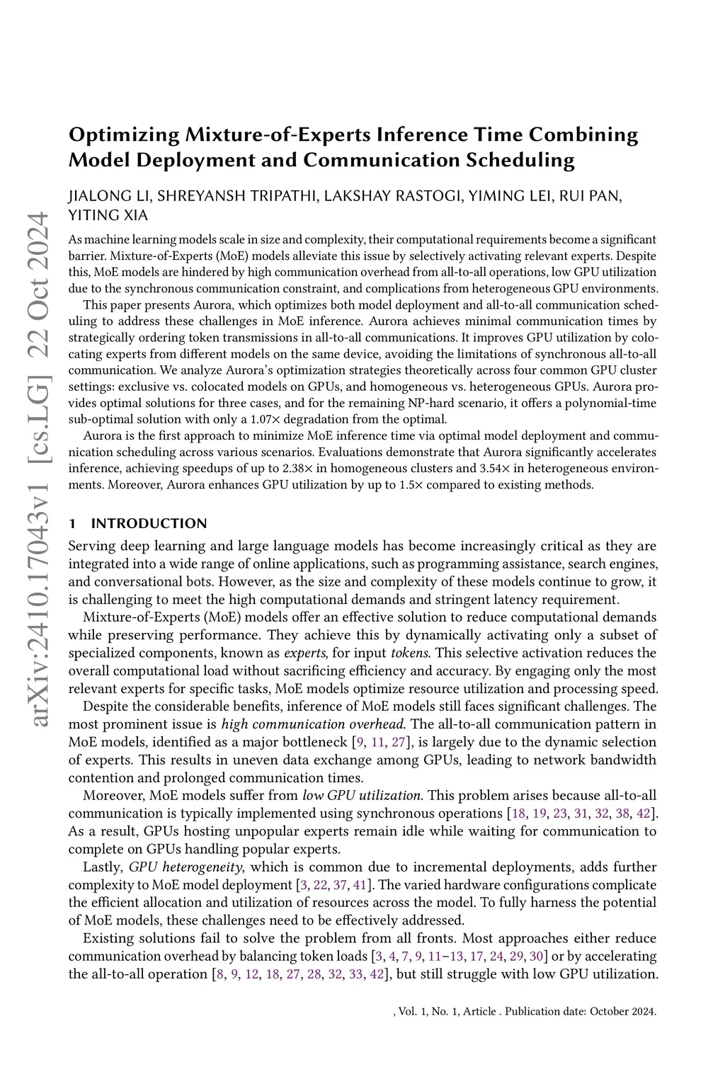 As machine learning models scale in size and complexity, their computational requirements become a significant barrier. Mixture-of-Experts (MoE) models alleviate this issue by selectively activating relevant experts. Despite this, MoE models are hindered by high communication overhead from all-to-all operations, low GPU utilization due to the synchronous communication constraint, and complications from heterogeneous GPU environments. This paper presents Aurora, which optimizes both model deployment and all-to-all communication scheduling to address these challenges in MoE inference. Aurora achieves minimal communication times by strategically ordering token transmissions in all-to-all communications. It improves GPU utilization by colocating experts from different models on the same device, avoiding the limitations of synchronous all-to-all communication. We analyze Aurora's optimization strategies theoretically across four common GPU cluster settings: exclusive vs. colocated models on GPUs, and homogeneous vs. heterogeneous GPUs. Aurora provides optimal solutions for three cases, and for the remaining NP-hard scenario, it offers a polynomial-time sub-optimal solution with only a 1.07x degradation from the optimal. Aurora is the first approach to minimize MoE inference time via optimal model deployment and communication scheduling across various scenarios. Evaluations demonstrate that Aurora significantly accelerates inference, achieving speedups of up to 2.38x in homogeneous clusters and 3.54x in heterogeneous environments. Moreover, Aurora enhances GPU utilization by up to 1.5x compared to existing methods.
