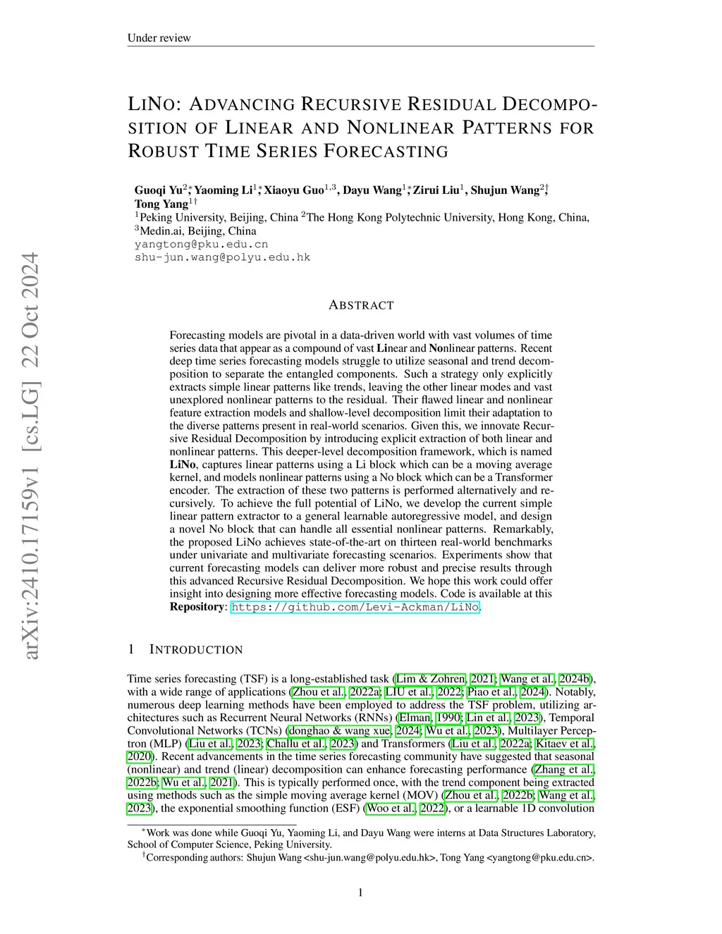 LiNo: Advancing Recursive Residual Decomposition of Linear and Nonlinear Patterns for Robust Time Series Forecasting