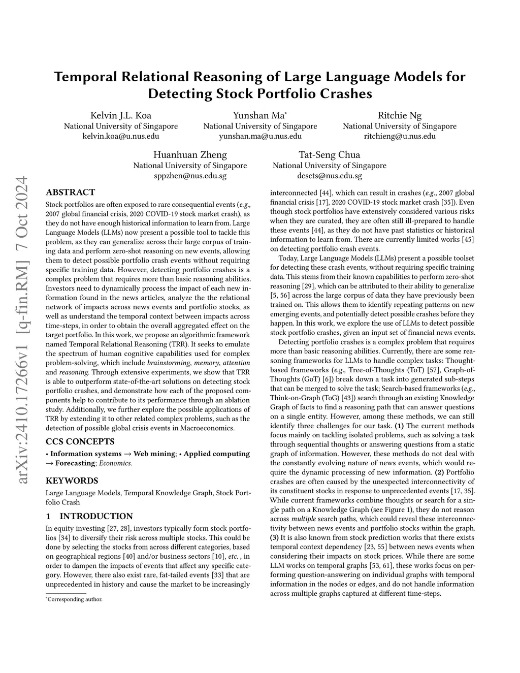 Stock portfolios are often exposed to rare consequential events (e.g., 2007 global financial crisis, 2020 COVID-19 stock market crash), as they do not have enough historical information to learn from. Large Language Models (LLMs) now present a possible tool to tackle this problem, as they can generalize across their large corpus of training data and perform zero-shot reasoning on new events, allowing them to detect possible portfolio crash events without requiring specific training data. However, detecting portfolio crashes is a complex problem that requires more than reasoning abilities. Investors need to dynamically process the impact of each new piece of information found in news articles, analyze the relational network of impacts across different events and portfolio stocks, as well as understand the temporal context between impacts across time-steps, in order to obtain the aggregated impact on the target portfolio. In this work, we propose an algorithmic framework named Temporal Relational Reasoning (TRR). It seeks to emulate the spectrum of human cognitive capabilities used for complex problem-solving, which include brainstorming, memory, attention and reasoning. Through extensive experiments, we show that TRR is able to outperform state-of-the-art techniques on detecting stock portfolio crashes, and demonstrate how each of the proposed components help to contribute to its performance through an ablation study. Additionally, we further explore the possible applications of TRR by extending it to other related complex problems, such as the detection of possible global crisis events in Macroeconomics.