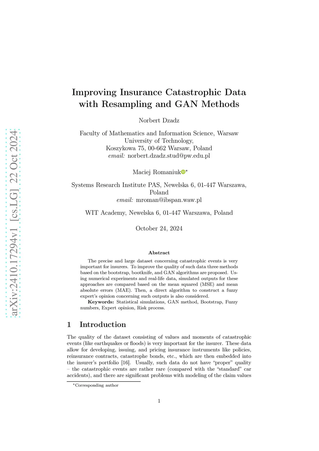 The precise and large dataset concerning catastrophic events is very important for insurers. To improve the quality of such data three methods based on the bootstrap, bootknife, and GAN algorithms are proposed. Using numerical experiments and real-life data, simulated outputs for these approaches are compared based on the mean squared (MSE) and mean absolute errors (MAE). Then, a direct algorithm to construct a fuzzy expert's opinion concerning such outputs is also considered.