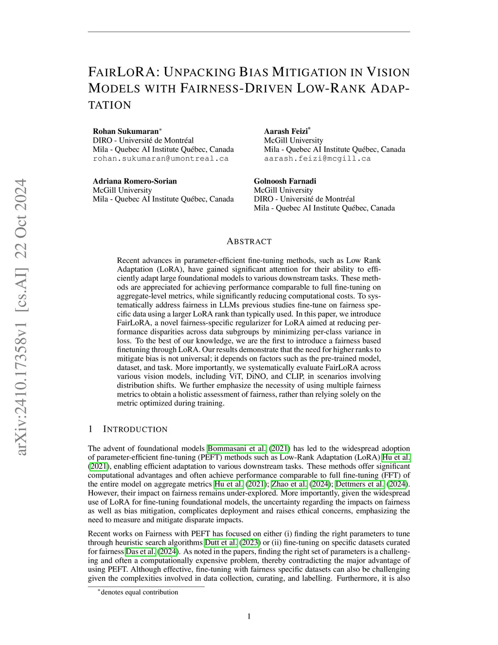 Recent advances in parameter-efficient fine-tuning methods, such as Low Rank Adaptation (LoRA), have gained significant attention for their ability to efficiently adapt large foundational models to various downstream tasks. These methods are appreciated for achieving performance comparable to full fine-tuning on aggregate-level metrics, while significantly reducing computational costs. To systematically address fairness in LLMs previous studies fine-tune on fairness specific data using a larger LoRA rank than typically used. In this paper, we introduce FairLoRA, a novel fairness-specific regularizer for LoRA aimed at reducing performance disparities across data subgroups by minimizing per-class variance in loss. To the best of our knowledge, we are the first to introduce a fairness based finetuning through LoRA. Our results demonstrate that the need for higher ranks to mitigate bias is not universal; it depends on factors such as the pre-trained model, dataset, and task. More importantly, we systematically evaluate FairLoRA across various vision models, including ViT, DiNO, and CLIP, in scenarios involving distribution shifts. We further emphasize the necessity of using multiple fairness metrics to obtain a holistic assessment of fairness, rather than relying solely on the metric optimized during training.