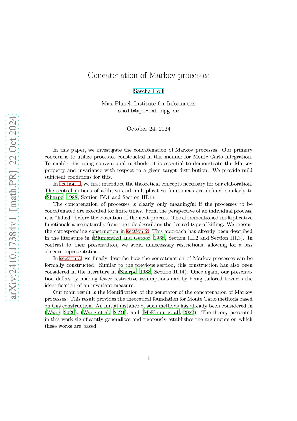 We investigate the concatenation of Markov processes. Our primary concern is to utilize processes constructed in this manner for Monte Carlo integration. To enable this using conventional methods, it is essential to demonstrate the Markov property and invariance with respect to a given target distribution. We provide mild sufficient conditions for this. Our main result is the identification of the generator of the concatenation of Markov processes. This result provides the theoretical foundation for Monte Carlo methods based on this construction.