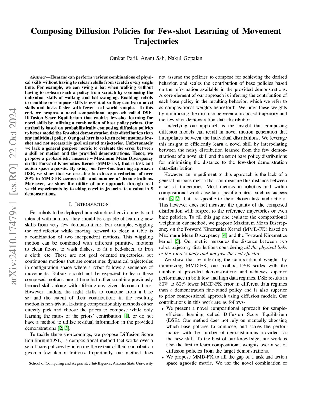 Humans can perform various combinations of physical skills without having to relearn skills from scratch every single time. For example, we can swing a bat when walking without having to re-learn such a policy from scratch by composing the individual skills of walking and bat swinging. Enabling robots to combine or compose skills is essential so they can learn novel skills and tasks faster with fewer real world samples. To this end, we propose a novel compositional approach called DSE- Diffusion Score Equilibrium that enables few-shot learning for novel skills by utilizing a combination of base policy priors. Our method is based on probabilistically composing diffusion policies to better model the few-shot demonstration data-distribution than any individual policy. Our goal here is to learn robot motions few-shot and not necessarily goal oriented trajectories. Unfortunately we lack a general purpose metric to evaluate the error between a skill or motion and the provided demonstrations. Hence, we propose a probabilistic measure - Maximum Mean Discrepancy on the Forward Kinematics Kernel (MMD-FK), that is task and action space agnostic. By using our few-shot learning approach DSE, we show that we are able to achieve a reduction of over 30% in MMD-FK across skills and number of demonstrations. Moreover, we show the utility of our approach through real world experiments by teaching novel trajectories to a robot in 5 demonstrations.