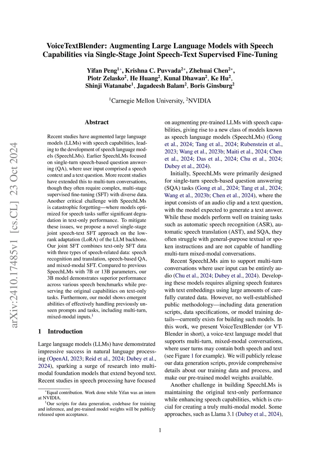 VoiceTextBlender: Augmenting Large Language Models with Speech Capabilities via Single-Stage Joint Speech-Text Supervised Fine-Tuning