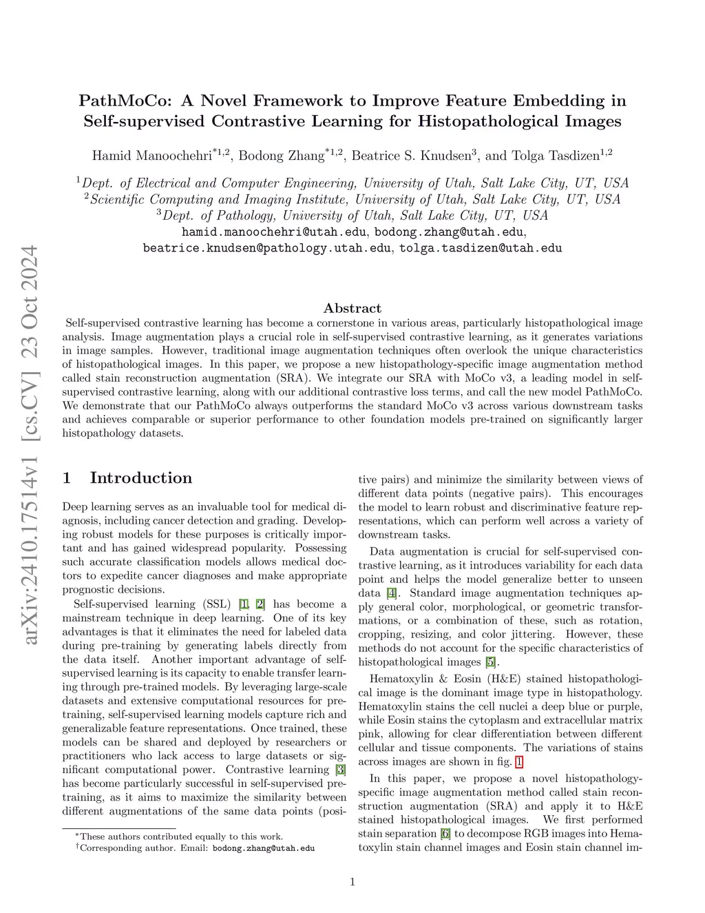 Self-supervised learning has become a cornerstone in various areas, particularly histopathological image analysis. Image augmentation plays a crucial role in self-supervised learning, as it generates variations in image samples. However, traditional image augmentation techniques often overlook the unique characteristics of histopathological images. In this paper, we propose a new histopathology-specific image augmentation method called stain reconstruction augmentation (SRA). We integrate our SRA with MoCo v3, a leading model in self-supervised contrastive learning, along with our additional contrastive loss terms, and call the new model SRA-MoCo v3. We demonstrate that our SRA-MoCo v3 always outperforms the standard MoCo v3 across various downstream tasks and achieves comparable or superior performance to other foundation models pre-trained on significantly larger histopathology datasets.