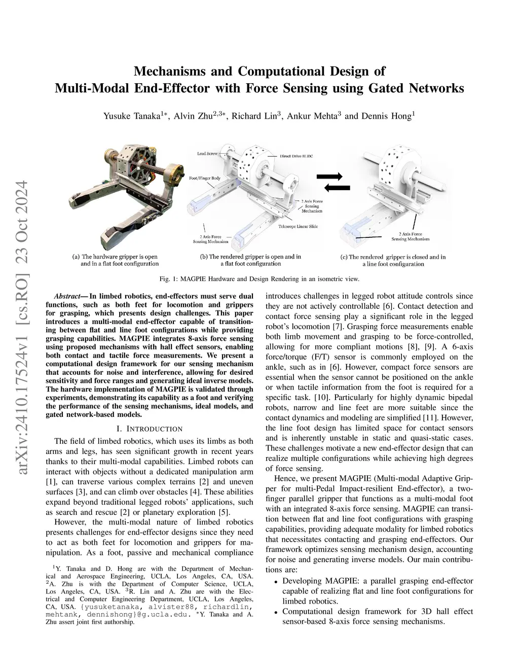 In limbed robotics, end-effectors must serve dual functions, such as both feet for locomotion and grippers for grasping, which presents design challenges. This paper introduces a multi-modal end-effector capable of transitioning between flat and line foot configurations while providing grasping capabilities. MAGPIE integrates 8-axis force sensing using proposed mechanisms with hall effect sensors, enabling both contact and tactile force measurements. We present a computational design framework for our sensing mechanism that accounts for noise and interference, allowing for desired sensitivity and force ranges and generating ideal inverse models. The hardware implementation of MAGPIE is validated through experiments, demonstrating its capability as a foot and verifying the performance of the sensing mechanisms, ideal models, and gated network-based models.