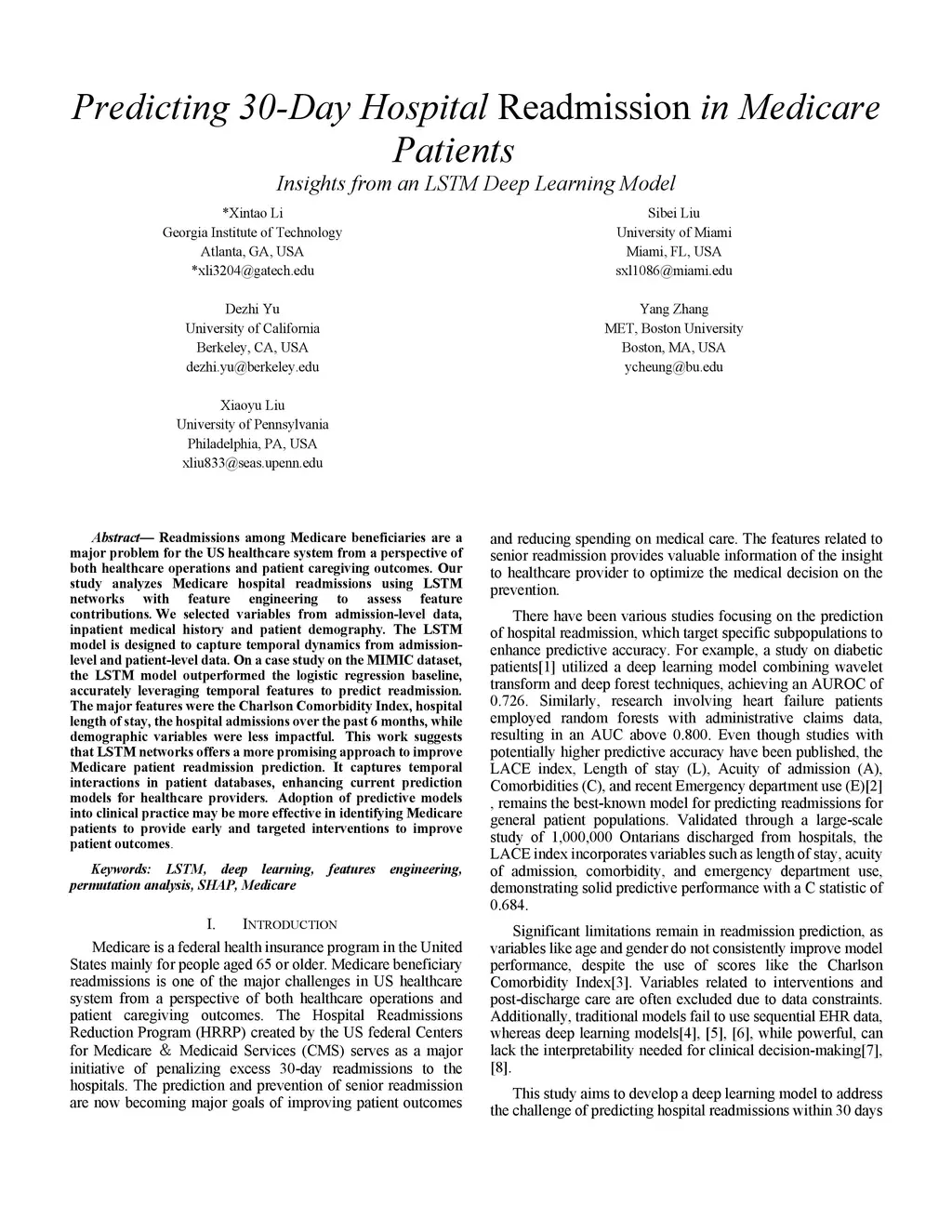 Readmissions among Medicare beneficiaries are a major problem for the US healthcare system from a perspective of both healthcare operations and patient caregiving outcomes. Our study analyzes Medicare hospital readmissions using LSTM networks with feature engineering to assess feature contributions. We selected variables from admission-level data, inpatient medical history and patient demography. The LSTM model is designed to capture temporal dynamics from admission-level and patient-level data. On a case study on the MIMIC dataset, the LSTM model outperformed the logistic regression baseline, accurately leveraging temporal features to predict readmission. The major features were the Charlson Comorbidity Index, hospital length of stay, the hospital admissions over the past 6 months, while demographic variables were less impactful. This work suggests that LSTM networks offers a more promising approach to improve Medicare patient readmission prediction. It captures temporal interactions in patient databases, enhancing current prediction models for healthcare providers. Adoption of predictive models into clinical practice may be more effective in identifying Medicare patients to provide early and targeted interventions to improve patient outcomes.