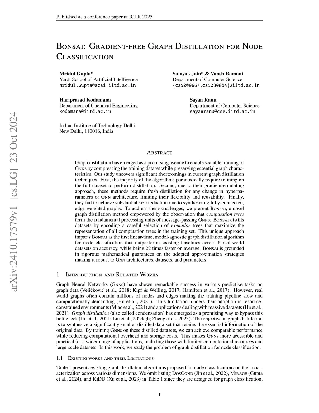 Graph condensation has emerged as a promising avenue to enable scalable training of GNNs by compressing the training dataset while preserving essential graph characteristics. Our study uncovers significant shortcomings in current graph condensation techniques. First, the majority of the algorithms paradoxically require training on the full dataset to perform condensation. Second, due to their gradient-emulating approach, these methods require fresh condensation for any change in hyperparameters or GNN architecture, limiting their flexibility and reusability. Finally, they fail to achieve substantial size reduction due to synthesizing fully-connected, edge-weighted graphs. To address these challenges, we present Bonsai, a novel graph condensation method empowered by the observation that \textit{computation trees} form the fundamental processing units of message-passing GNNs. Bonsai condenses datasets by encoding a careful selection of \textit{exemplar} trees that maximize the representation of all computation trees in the training set. This unique approach imparts Bonsai as the first linear-time, model-agnostic graph condensation algorithm for node classification that outperforms existing baselines across real-world datasets on accuracy, while being times faster on average. Bonsai is grounded in rigorous mathematical guarantees on the adopted approximation strategies making it robust to GNN architectures, datasets, and parameters.