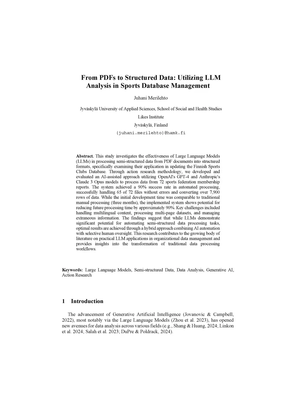 This study investigates the effectiveness of Large Language Models (LLMs) in processing semi-structured data from PDF documents into structured formats, specifically examining their application in updating the Finnish Sports Clubs Database. Through action research methodology, we developed and evaluated an AI-assisted approach utilizing OpenAI's GPT-4 and Anthropic's Claude 3 Opus models to process data from 72 sports federation membership reports. The system achieved a 90% success rate in automated processing, successfully handling 65 of 72 files without errors and converting over 7,900 rows of data. While the initial development time was comparable to traditional manual processing (three months), the implemented system shows potential for reducing future processing time by approximately 90%. Key challenges included handling multilingual content, processing multi-page datasets, and managing extraneous information. The findings suggest that while LLMs demonstrate significant potential for automating semi-structured data processing tasks, optimal results are achieved through a hybrid approach combining AI automation with selective human oversight. This research contributes to the growing body of literature on practical LLM applications in organizational data management and provides insights into the transformation of traditional data processing workflows.