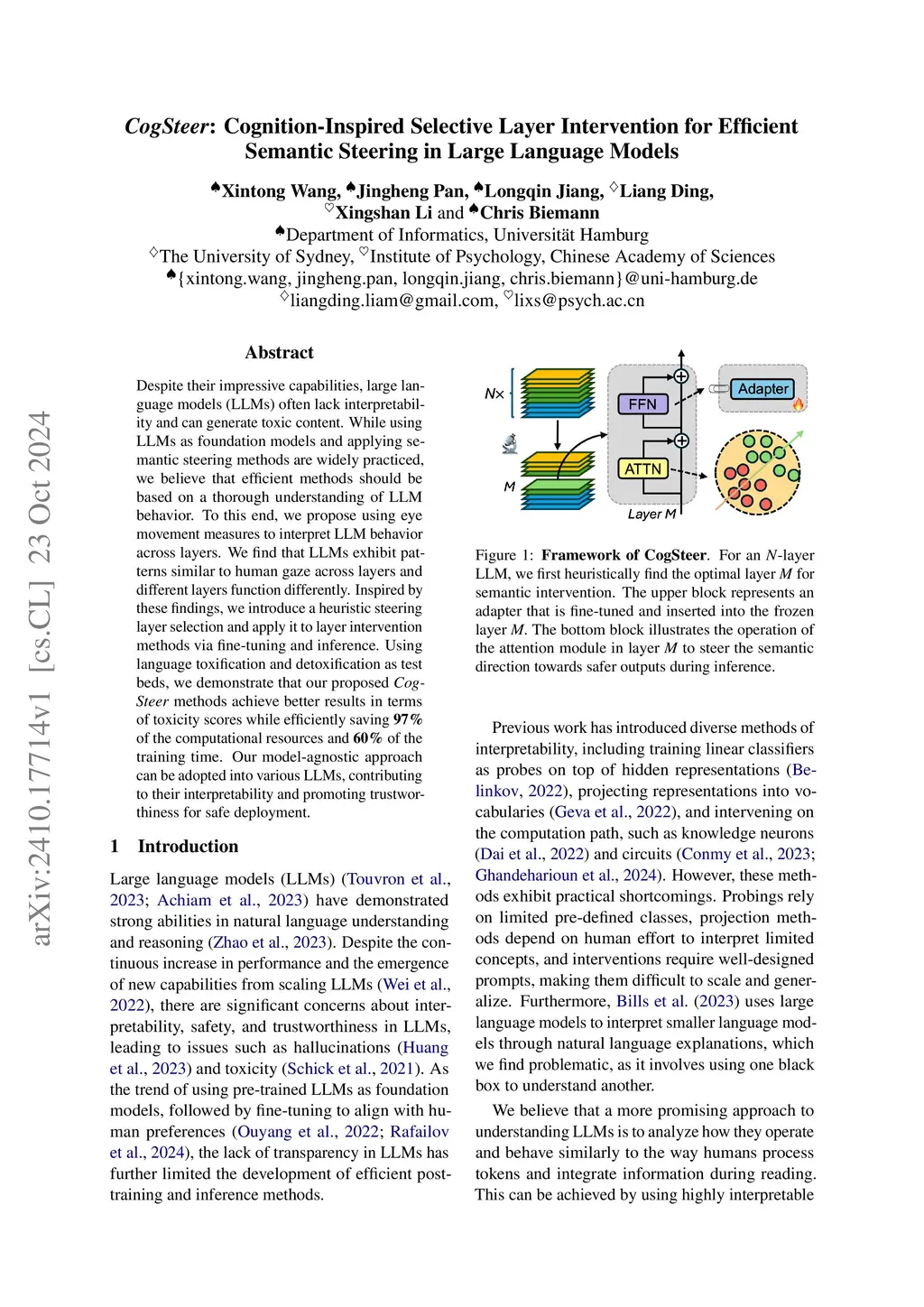 Large Language Models (LLMs) achieve remarkable performance through pretraining on extensive data. This enables efficient adaptation to diverse downstream tasks. However, the lack of interpretability in their underlying mechanisms limits the ability to effectively steer LLMs for specific applications. In this work, we investigate the intrinsic mechanisms of LLMs from a cognitive perspective using eye movement measures. Specifically, we analyze the layer-wise correlation between human cognitive indicators and LLM representations. Building on these insights, we propose a heuristic approach for selecting the optimal steering layer to modulate LLM semantics. To this end, we introduce an efficient selective layer intervention based on prominent parameter-efficient fine-tuning methods, which conventionally adjust either all layers or only the final layer. Additionally, we present an implicit layer contrastive intervention during inference to steer LLMs away from toxic outputs. Extensive experiments on natural language understanding, reasoning, and generation tasks, conducted on GPT-2, Llama2-7B, and Mistral-7B, demonstrate the effectiveness and efficiency of our approach. As a model-agnostic framework, it enhances the interpretability of LLMs while improving efficiency for safe deployment.