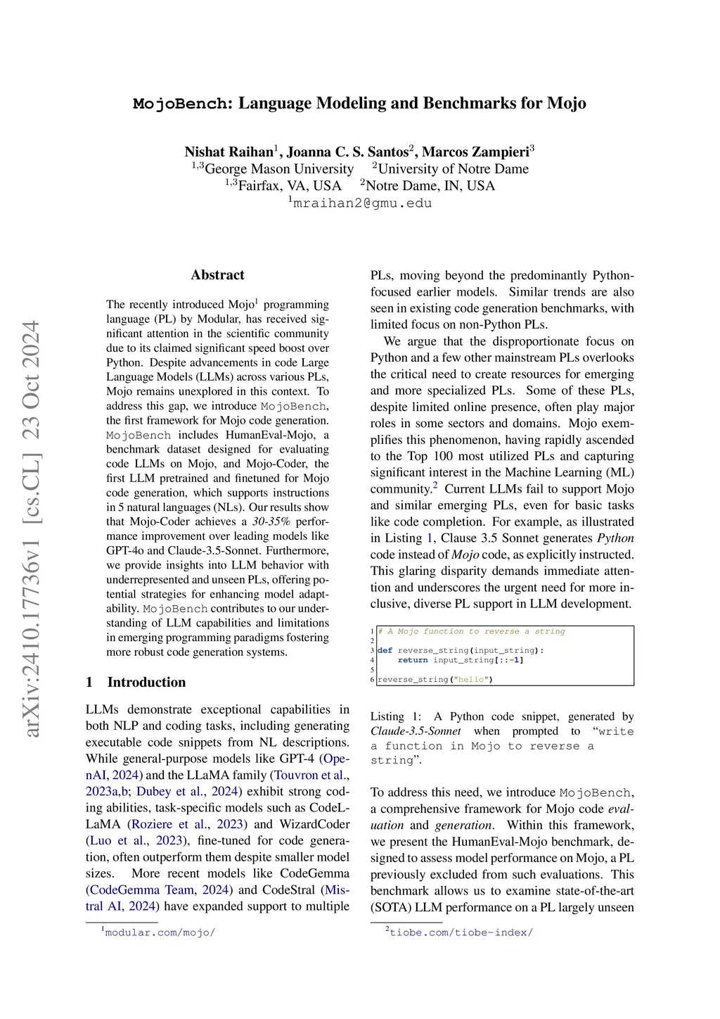The recently introduced Mojo programming language (PL) by Modular, has received significant attention in the scientific community due to its claimed significant speed boost over Python. Despite advancements in code Large Language Models (LLMs) across various PLs, Mojo remains unexplored in this context. To address this gap, we introduce MojoBench, the first framework for Mojo code generation. MojoBench includes HumanEval-Mojo, a benchmark dataset designed for evaluating code LLMs on Mojo, and Mojo-Coder, the first LLM pretrained and finetuned for Mojo code generation, which supports instructions in 5 natural languages (NLs). Our results show that Mojo-Coder achieves a 30-35% performance improvement over leading models like GPT-4o and Claude-3.5-Sonnet. Furthermore, we provide insights into LLM behavior with underrepresented and unseen PLs, offering potential strategies for enhancing model adaptability. MojoBench contributes to our understanding of LLM capabilities and limitations in emerging programming paradigms fostering more robust code generation systems.