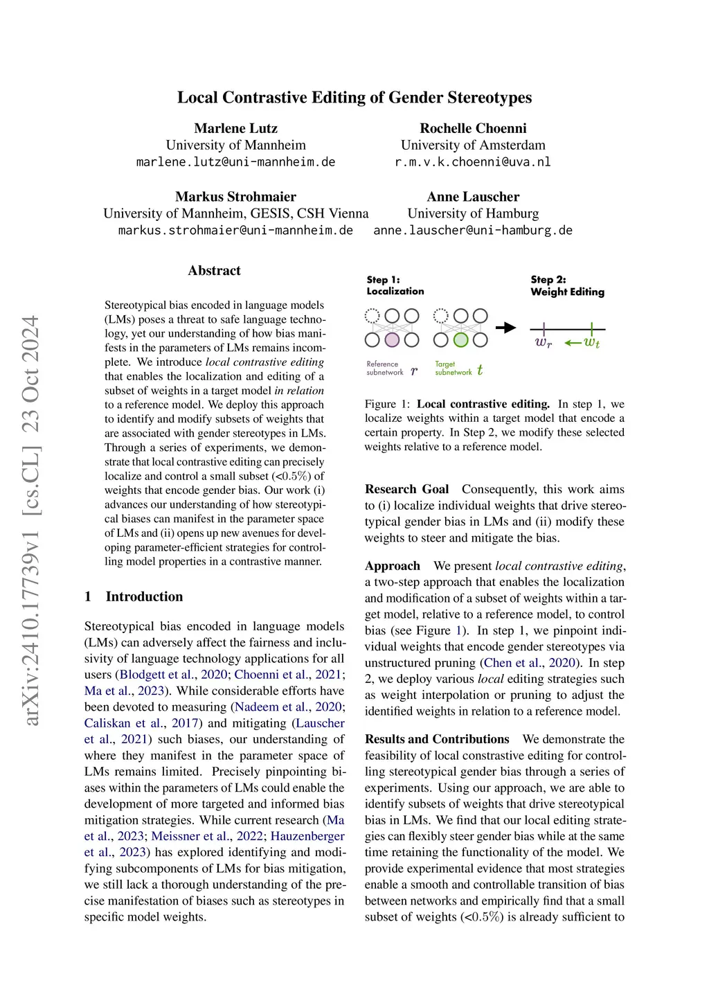 Stereotypical bias encoded in language models (LMs) poses a threat to safe language technology, yet our understanding of how bias manifests in the parameters of LMs remains incomplete. We introduce local contrastive editing that enables the localization and editing of a subset of weights in a target model in relation to a reference model. We deploy this approach to identify and modify subsets of weights that are associated with gender stereotypes in LMs. Through a series of experiments, we demonstrate that local contrastive editing can precisely localize and control a small subset (< 0.5%) of weights that encode gender bias. Our work (i) advances our understanding of how stereotypical biases can manifest in the parameter space of LMs and (ii) opens up new avenues for developing parameter-efficient strategies for controlling model properties in a contrastive manner.