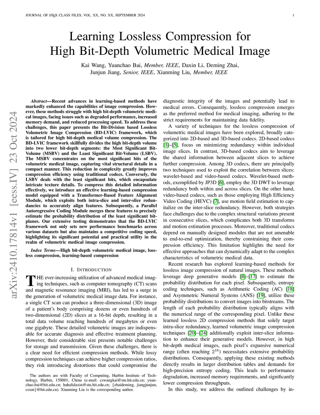 Recent advances in learning-based methods have markedly enhanced the capabilities of image compression. However, these methods struggle with high bit-depth volumetric medical images, facing issues such as degraded performance, increased memory demand, and reduced processing speed. To address these challenges, this paper presents the Bit-Division based Lossless Volumetric Image Compression (BD-LVIC) framework, which is tailored for high bit-depth medical volume compression. The BD-LVIC framework skillfully divides the high bit-depth volume into two lower bit-depth segments: the Most Significant Bit-Volume (MSBV) and the Least Significant Bit-Volume (LSBV). The MSBV concentrates on the most significant bits of the volumetric medical image, capturing vital structural details in a compact manner. This reduction in complexity greatly improves compression efficiency using traditional codecs. Conversely, the LSBV deals with the least significant bits, which encapsulate intricate texture details. To compress this detailed information effectively, we introduce an effective learning-based compression model equipped with a Transformer-Based Feature Alignment Module, which exploits both intra-slice and inter-slice redundancies to accurately align features. Subsequently, a Parallel Autoregressive Coding Module merges these features to precisely estimate the probability distribution of the least significant bit-planes. Our extensive testing demonstrates that the BD-LVIC framework not only sets new performance benchmarks across various datasets but also maintains a competitive coding speed, highlighting its significant potential and practical utility in the realm of volumetric medical image compression.