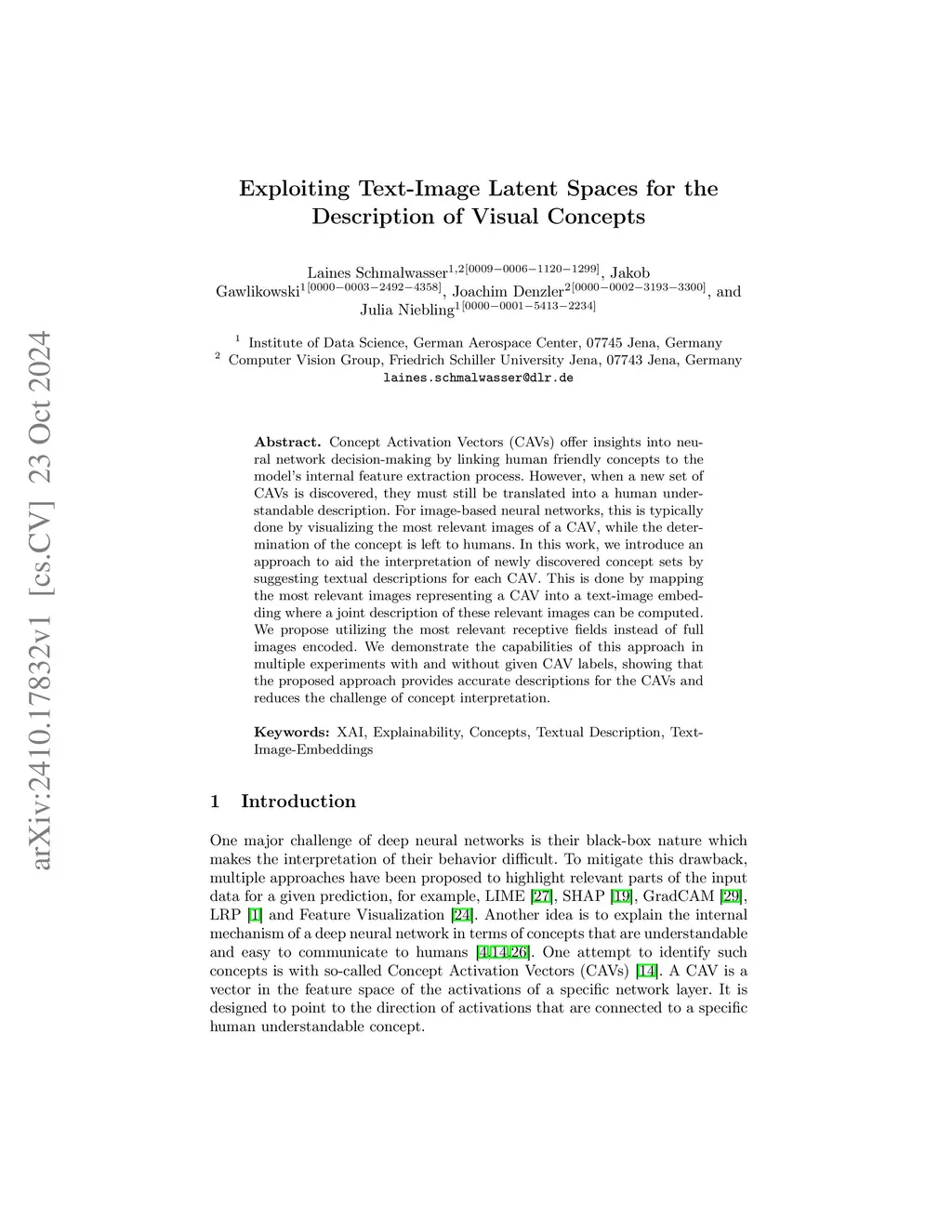 Concept Activation Vectors (CAVs) offer insights into neural network decision-making by linking human friendly concepts to the model's internal feature extraction process. However, when a new set of CAVs is discovered, they must still be translated into a human understandable description. For image-based neural networks, this is typically done by visualizing the most relevant images of a CAV, while the determination of the concept is left to humans. In this work, we introduce an approach to aid the interpretation of newly discovered concept sets by suggesting textual descriptions for each CAV. This is done by mapping the most relevant images representing a CAV into a text-image embedding where a joint description of these relevant images can be computed. We propose utilizing the most relevant receptive fields instead of full images encoded. We demonstrate the capabilities of this approach in multiple experiments with and without given CAV labels, showing that the proposed approach provides accurate descriptions for the CAVs and reduces the challenge of concept interpretation.
