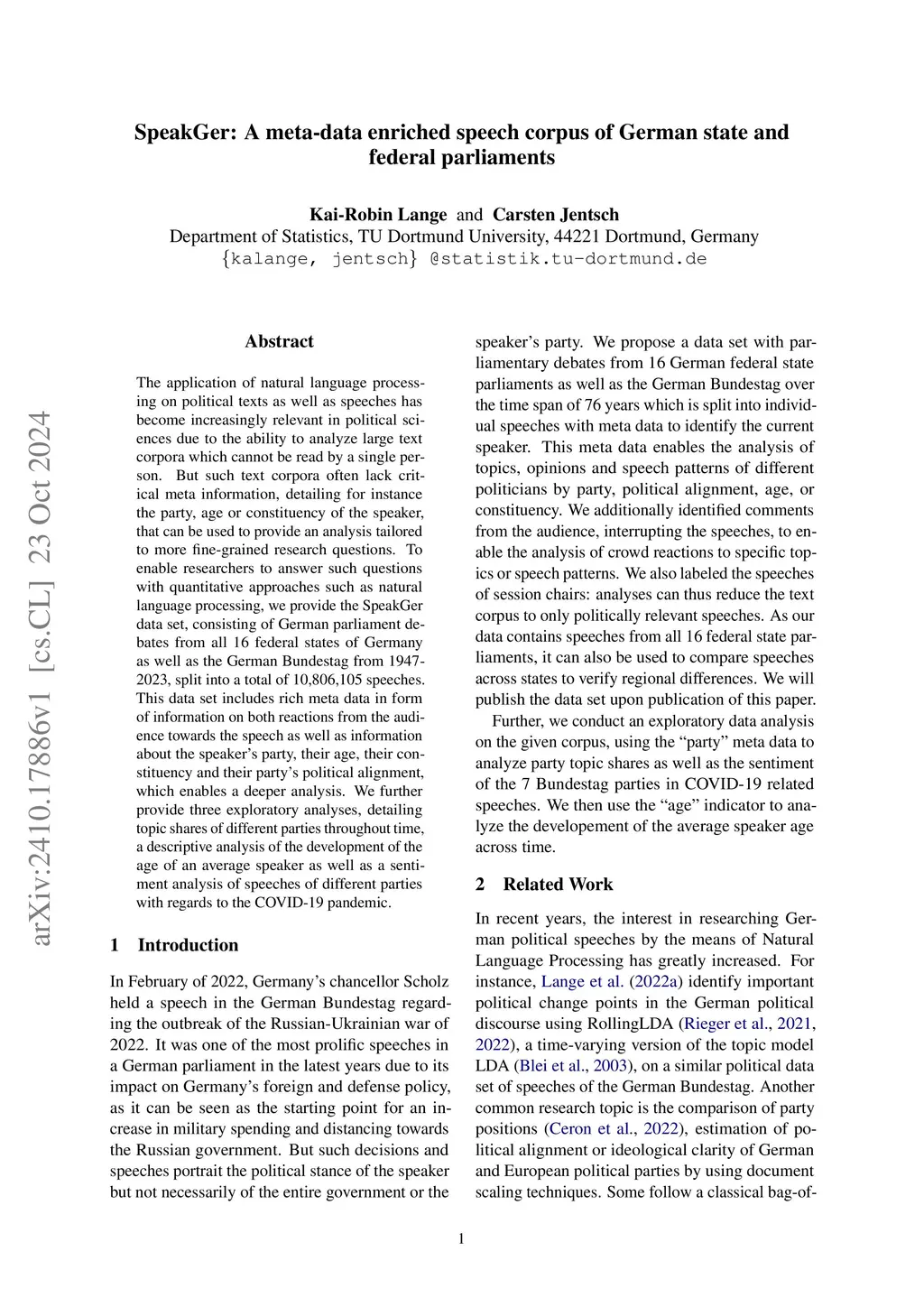 The application of natural language processing on political texts as well as speeches has become increasingly relevant in political sciences due to the ability to analyze large text corpora which cannot be read by a single person. But such text corpora often lack critical meta information, detailing for instance the party, age or constituency of the speaker, that can be used to provide an analysis tailored to more fine-grained research questions. To enable researchers to answer such questions with quantitative approaches such as natural language processing, we provide the SpeakGer data set, consisting of German parliament debates from all 16 federal states of Germany as well as the German Bundestag from 1947-2023, split into a total of 10,806,105 speeches. This data set includes rich meta data in form of information on both reactions from the audience towards the speech as well as information about the speaker's party, their age, their constituency and their party's political alignment, which enables a deeper analysis. We further provide three exploratory analyses, detailing topic shares of different parties throughout time, a descriptive analysis of the development of the age of an average speaker as well as a sentiment analysis of speeches of different parties with regards to the COVID-19 pandemic.