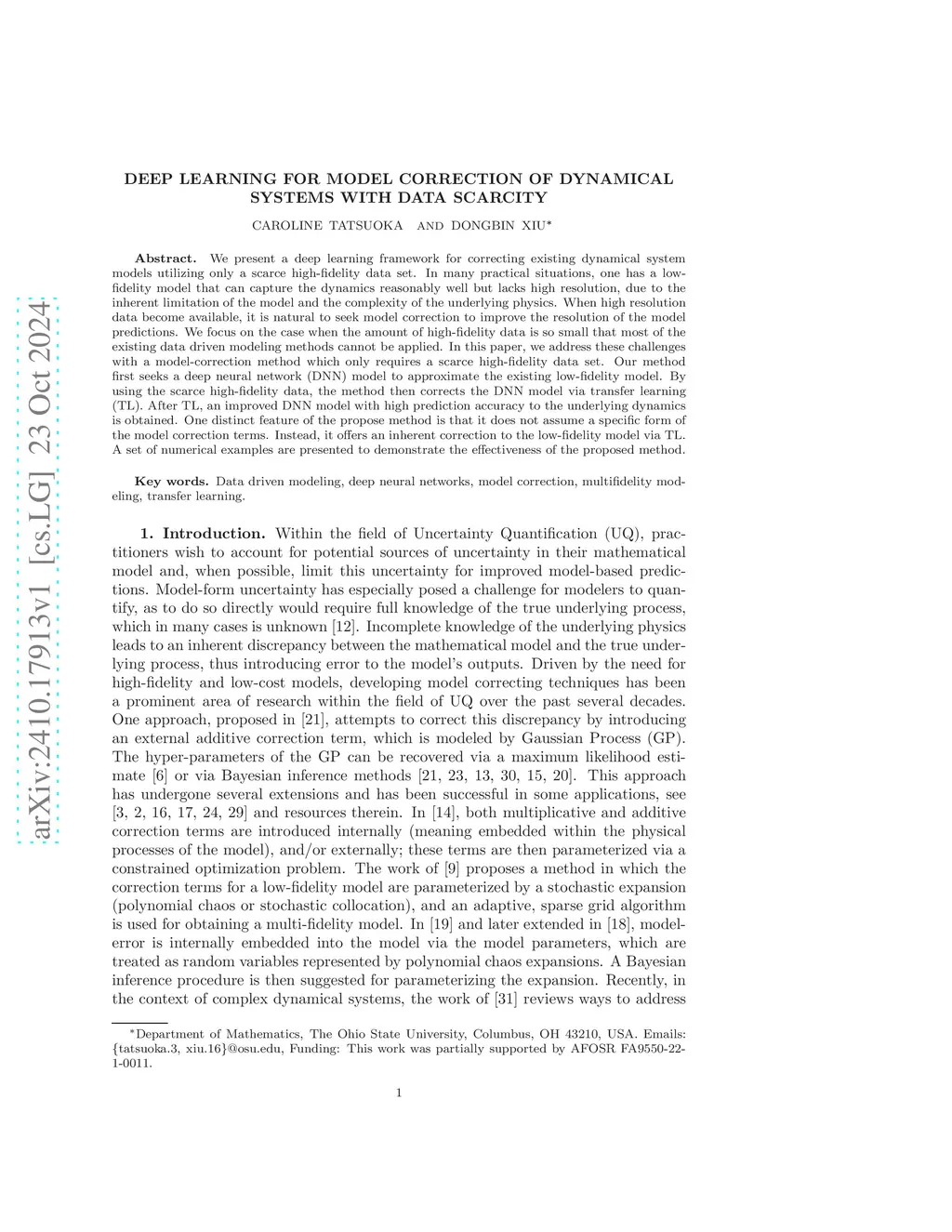 We present a deep learning framework for correcting existing dynamical system models utilizing only a scarce high-fidelity data set. In many practical situations, one has a low-fidelity model that can capture the dynamics reasonably well but lacks high resolution, due to the inherent limitation of the model and the complexity of the underlying physics. When high resolution data become available, it is natural to seek model correction to improve the resolution of the model predictions. We focus on the case when the amount of high-fidelity data is so small that most of the existing data driven modeling methods cannot be applied. In this paper, we address these challenges with a model-correction method which only requires a scarce high-fidelity data set. Our method first seeks a deep neural network (DNN) model to approximate the existing low-fidelity model. By using the scarce high-fidelity data, the method then corrects the DNN model via transfer learning (TL). After TL, an improved DNN model with high prediction accuracy to the underlying dynamics is obtained. One distinct feature of the propose method is that it does not assume a specific form of the model correction terms. Instead, it offers an inherent correction to the low-fidelity model via TL. A set of numerical examples are presented to demonstrate the effectiveness of the proposed method.