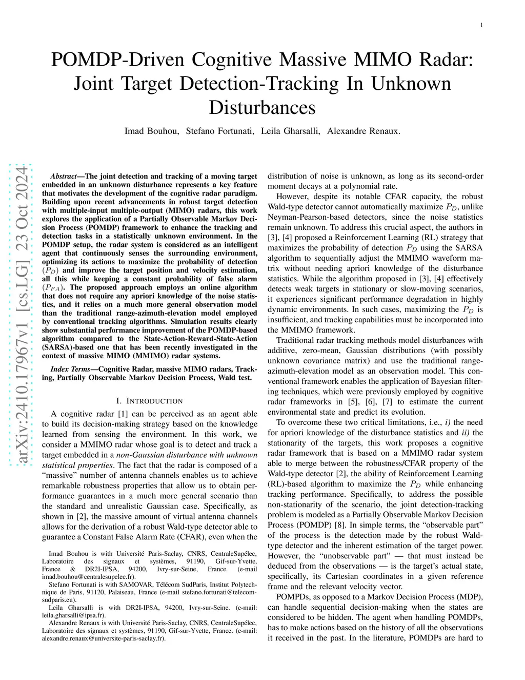 POMDP-Driven Cognitive Massive MIMO Radar: Joint Target Detection-Tracking In Unknown Disturbances