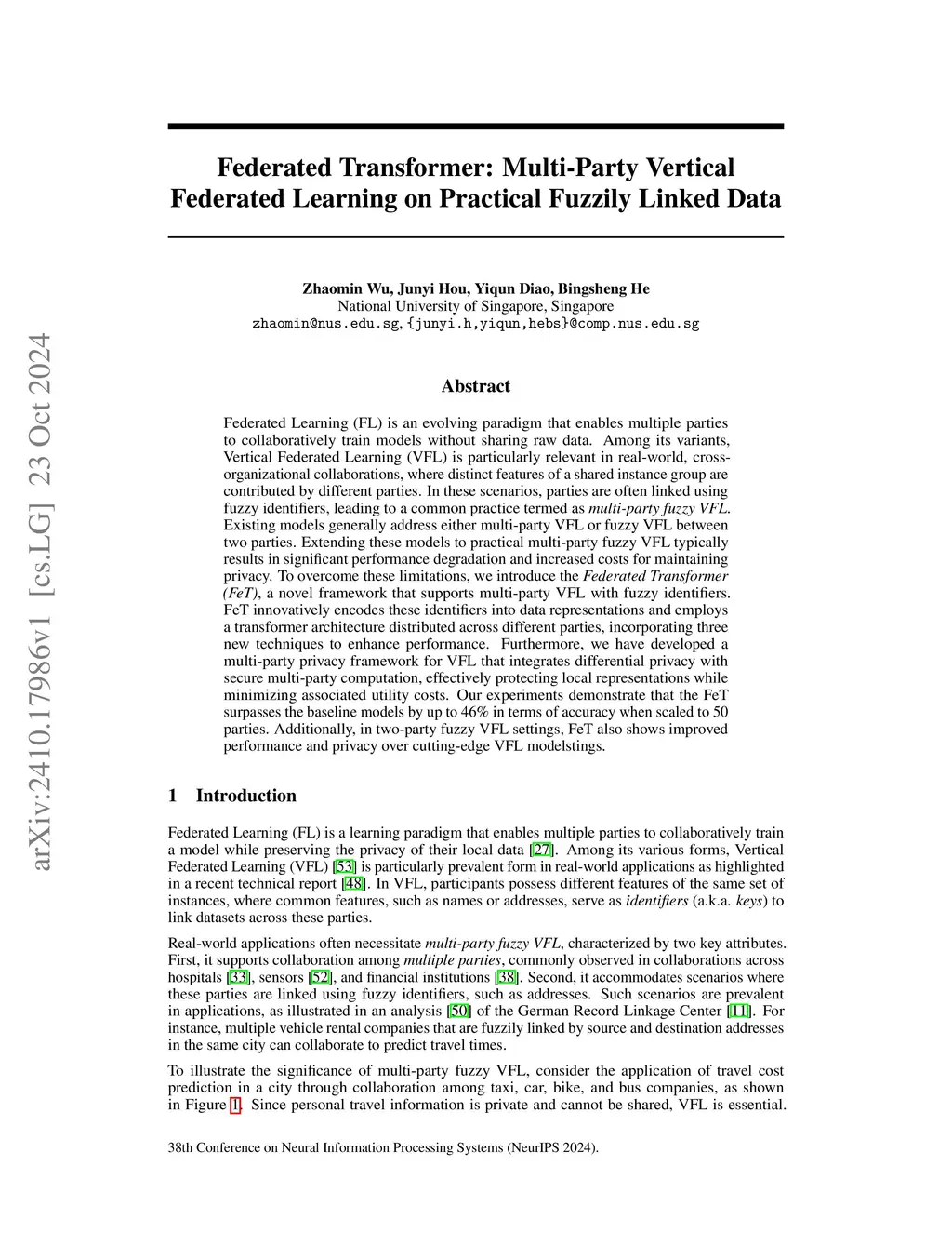 Federated Learning (FL) is an evolving paradigm that enables multiple parties to collaboratively train models without sharing raw data. Among its variants, Vertical Federated Learning (VFL) is particularly relevant in real-world, cross-organizational collaborations, where distinct features of a shared instance group are contributed by different parties. In these scenarios, parties are often linked using fuzzy identifiers, leading to a common practice termed as multi-party fuzzy VFL. Existing models generally address either multi-party VFL or fuzzy VFL between two parties. Extending these models to practical multi-party fuzzy VFL typically results in significant performance degradation and increased costs for maintaining privacy. To overcome these limitations, we introduce the Federated Transformer (FeT), a novel framework that supports multi-party VFL with fuzzy identifiers. FeT innovatively encodes these identifiers into data representations and employs a transformer architecture distributed across different parties, incorporating three new techniques to enhance performance. Furthermore, we have developed a multi-party privacy framework for VFL that integrates differential privacy with secure multi-party computation, effectively protecting local representations while minimizing associated utility costs. Our experiments demonstrate that the FeT surpasses the baseline models by up to 46\% in terms of accuracy when scaled to 50 parties. Additionally, in two-party fuzzy VFL settings, FeT also shows improved performance and privacy over cutting-edge VFL models.