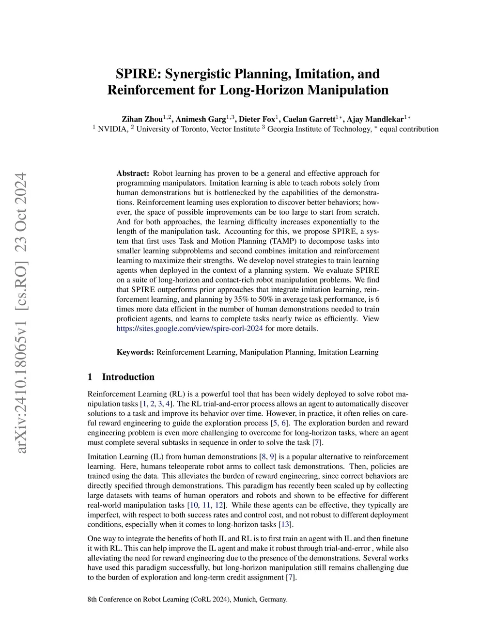Robot learning has proven to be a general and effective technique for programming manipulators. Imitation learning is able to teach robots solely from human demonstrations but is bottlenecked by the capabilities of the demonstrations. Reinforcement learning uses exploration to discover better behaviors; however, the space of possible improvements can be too large to start from scratch. And for both techniques, the learning difficulty increases proportional to the length of the manipulation task. Accounting for this, we propose SPIRE, a system that first uses Task and Motion Planning (TAMP) to decompose tasks into smaller learning subproblems and second combines imitation and reinforcement learning to maximize their strengths. We develop novel strategies to train learning agents when deployed in the context of a planning system. We evaluate SPIRE on a suite of long-horizon and contact-rich robot manipulation problems. We find that SPIRE outperforms prior approaches that integrate imitation learning, reinforcement learning, and planning by 35% to 50% in average task performance, is 6 times more data efficient in the number of human demonstrations needed to train proficient agents, and learns to complete tasks nearly twice as efficiently. View https://sites.google.com/view/spire-corl-2024 for more details.