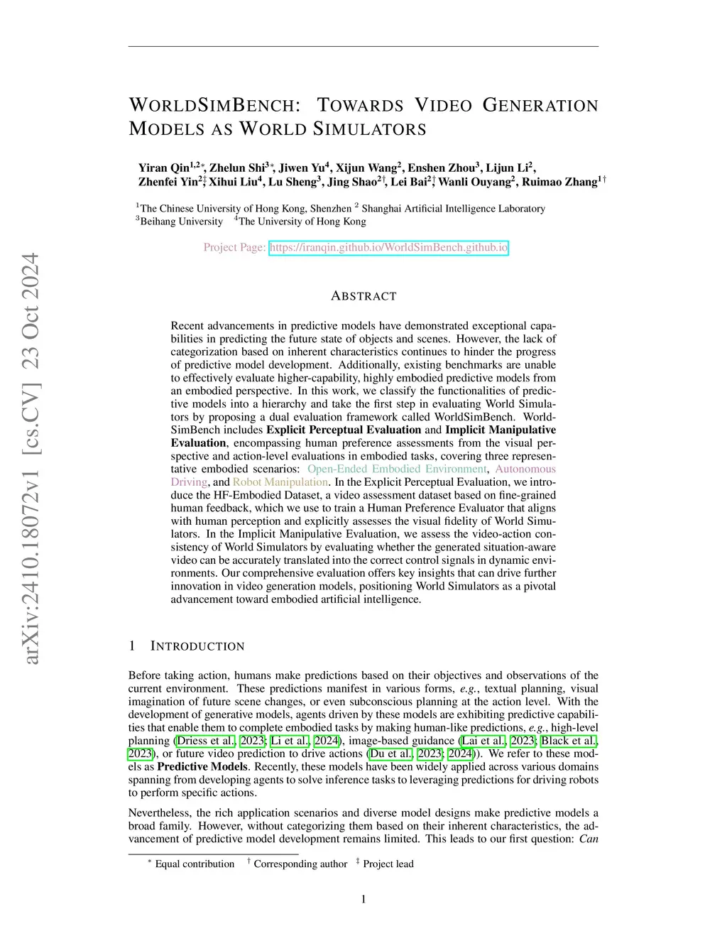 Recent advancements in predictive models have demonstrated exceptional capabilities in predicting the future state of objects and scenes. However, the lack of categorization based on inherent characteristics continues to hinder the progress of predictive model development. Additionally, existing benchmarks are unable to effectively evaluate higher-capability, highly embodied predictive models from an embodied perspective. In this work, we classify the functionalities of predictive models into a hierarchy and take the first step in evaluating World Simulators by proposing a dual evaluation framework called WorldSimBench. WorldSimBench includes Explicit Perceptual Evaluation and Implicit Manipulative Evaluation, encompassing human preference assessments from the visual perspective and action-level evaluations in embodied tasks, covering three representative embodied scenarios: Open-Ended Embodied Environment, Autonomous, Driving, and Robot Manipulation. In the Explicit Perceptual Evaluation, we introduce the HF-Embodied Dataset, a video assessment dataset based on fine-grained human feedback, which we use to train a Human Preference Evaluator that aligns with human perception and explicitly assesses the visual fidelity of World Simulators. In the Implicit Manipulative Evaluation, we assess the video-action consistency of World Simulators by evaluating whether the generated situation-aware video can be accurately translated into the correct control signals in dynamic environments. Our comprehensive evaluation offers key insights that can drive further innovation in video generation models, positioning World Simulators as a pivotal advancement toward embodied artificial intelligence.