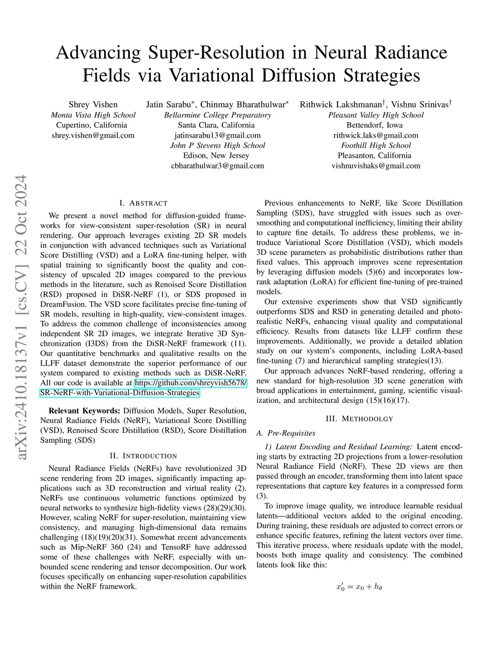 We present a novel method for diffusion-guided frameworks for view-consistent super-resolution (SR) in neural rendering. Our approach leverages existing 2D SR models in conjunction with advanced techniques such as Variational Score Distilling (VSD) and a LoRA fine-tuning helper, with spatial training to significantly boost the quality and consistency of upscaled 2D images compared to the previous methods in the literature, such as Renoised Score Distillation (RSD) proposed in DiSR-NeRF (1), or SDS proposed in DreamFusion. The VSD score facilitates precise fine-tuning of SR models, resulting in high-quality, view-consistent images. To address the common challenge of inconsistencies among independent SR 2D images, we integrate Iterative 3D Synchronization (I3DS) from the DiSR-NeRF framework. Our quantitative benchmarks and qualitative results on the LLFF dataset demonstrate the superior performance of our system compared to existing methods such as DiSR-NeRF.