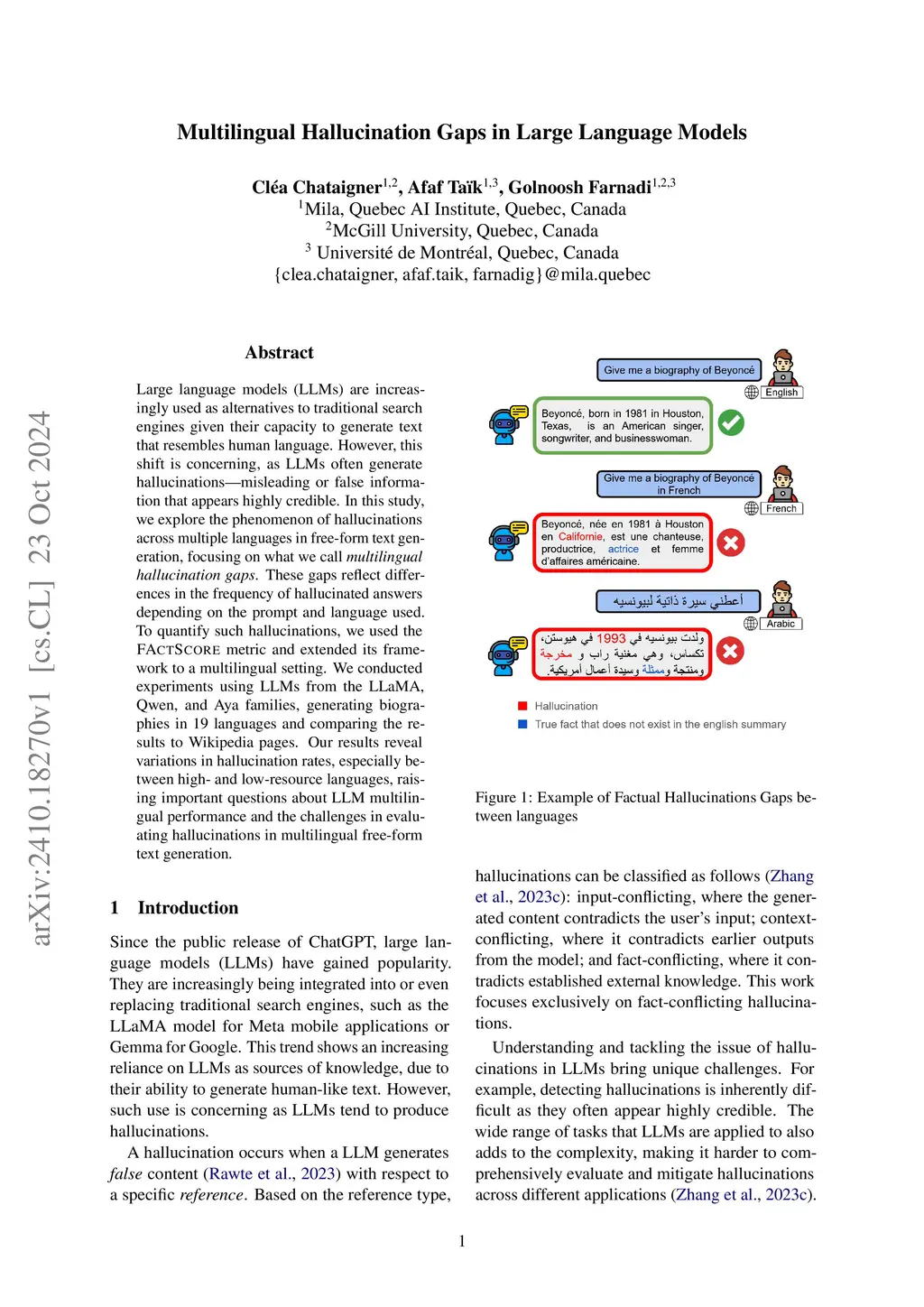 Large language models (LLMs) are increasingly used as alternatives to traditional search engines given their capacity to generate text that resembles human language. However, this shift is concerning, as LLMs often generate hallucinations, misleading or false information that appears highly credible. In this study, we explore the phenomenon of hallucinations across multiple languages in freeform text generation, focusing on what we call multilingual hallucination gaps. These gaps reflect differences in the frequency of hallucinated answers depending on the prompt and language used. To quantify such hallucinations, we used the FactScore metric and extended its framework to a multilingual setting. We conducted experiments using LLMs from the LLaMA, Qwen, and Aya families, generating biographies in 19 languages and comparing the results to Wikipedia pages. Our results reveal variations in hallucination rates, especially between high and low resource languages, raising important questions about LLM multilingual performance and the challenges in evaluating hallucinations in multilingual freeform text generation.