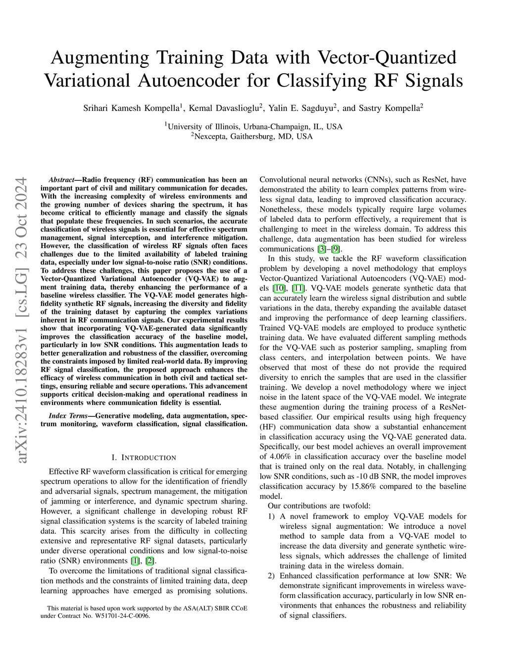 Radio frequency (RF) communication has been an important part of civil and military communication for decades. With the increasing complexity of wireless environments and the growing number of devices sharing the spectrum, it has become critical to efficiently manage and classify the signals that populate these frequencies. In such scenarios, the accurate classification of wireless signals is essential for effective spectrum management, signal interception, and interference mitigation. However, the classification of wireless RF signals often faces challenges due to the limited availability of labeled training data, especially under low signal-to-noise ratio (SNR) conditions. To address these challenges, this paper proposes the use of a Vector-Quantized Variational Autoencoder (VQ-VAE) to augment training data, thereby enhancing the performance of a baseline wireless classifier. The VQ-VAE model generates high-fidelity synthetic RF signals, increasing the diversity and fidelity of the training dataset by capturing the complex variations inherent in RF communication signals. Our experimental results show that incorporating VQ-VAE-generated data significantly improves the classification accuracy of the baseline model, particularly in low SNR conditions. This augmentation leads to better generalization and robustness of the classifier, overcoming the constraints imposed by limited real-world data. By improving RF signal classification, the proposed approach enhances the efficacy of wireless communication in both civil and tactical settings, ensuring reliable and secure operations. This advancement supports critical decision-making and operational readiness in environments where communication fidelity is essential.
