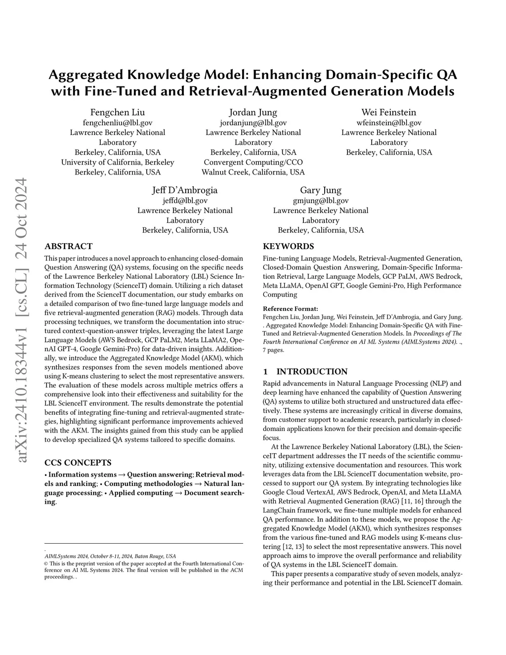 This paper introduces a novel approach to enhancing closed-domain Question Answering (QA) systems, focusing on the specific needs of the Lawrence Berkeley National Laboratory (LBL) Science Information Technology (ScienceIT) domain. Utilizing a rich dataset derived from the ScienceIT documentation, our study embarks on a detailed comparison of two fine-tuned large language models and five retrieval-augmented generation (RAG) models. Through data processing techniques, we transform the documentation into structured context-question-answer triples, leveraging the latest Large Language Models (AWS Bedrock, GCP PaLM2, Meta LLaMA2, OpenAI GPT-4, Google Gemini-Pro) for data-driven insights. Additionally, we introduce the Aggregated Knowledge Model (AKM), which synthesizes responses from the seven models mentioned above using K-means clustering to select the most representative answers. The evaluation of these models across multiple metrics offers a comprehensive look into their effectiveness and suitability for the LBL ScienceIT environment. The results demonstrate the potential benefits of integrating fine-tuning and retrieval-augmented strategies, highlighting significant performance improvements achieved with the AKM. The insights gained from this study can be applied to develop specialized QA systems tailored to specific domains.