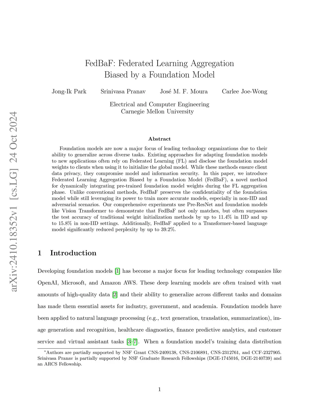 Foundation models are now a major focus of leading technology organizations due to their ability to generalize across diverse tasks. Existing approaches for adapting foundation models to new applications often rely on Federated Learning (FL) and disclose the foundation model weights to clients when using it to initialize the global model. While these methods ensure client data privacy, they compromise model and information security. In this paper, we introduce Federated Learning Aggregation Biased by a Foundation Model (FedBaF), a novel method for dynamically integrating pre-trained foundation model weights during the FL aggregation phase. Unlike conventional methods, FedBaF preserves the confidentiality of the foundation model while still leveraging its power to train more accurate models, especially in non-IID and adversarial scenarios. Our comprehensive experiments use Pre-ResNet and foundation models like Vision Transformer to demonstrate that FedBaF not only matches, but often surpasses the test accuracy of traditional weight initialization methods by up to 11.4% in IID and up to 15.8% in non-IID settings. Additionally, FedBaF applied to a Transformer-based language model significantly reduced perplexity by up to 39.2%.