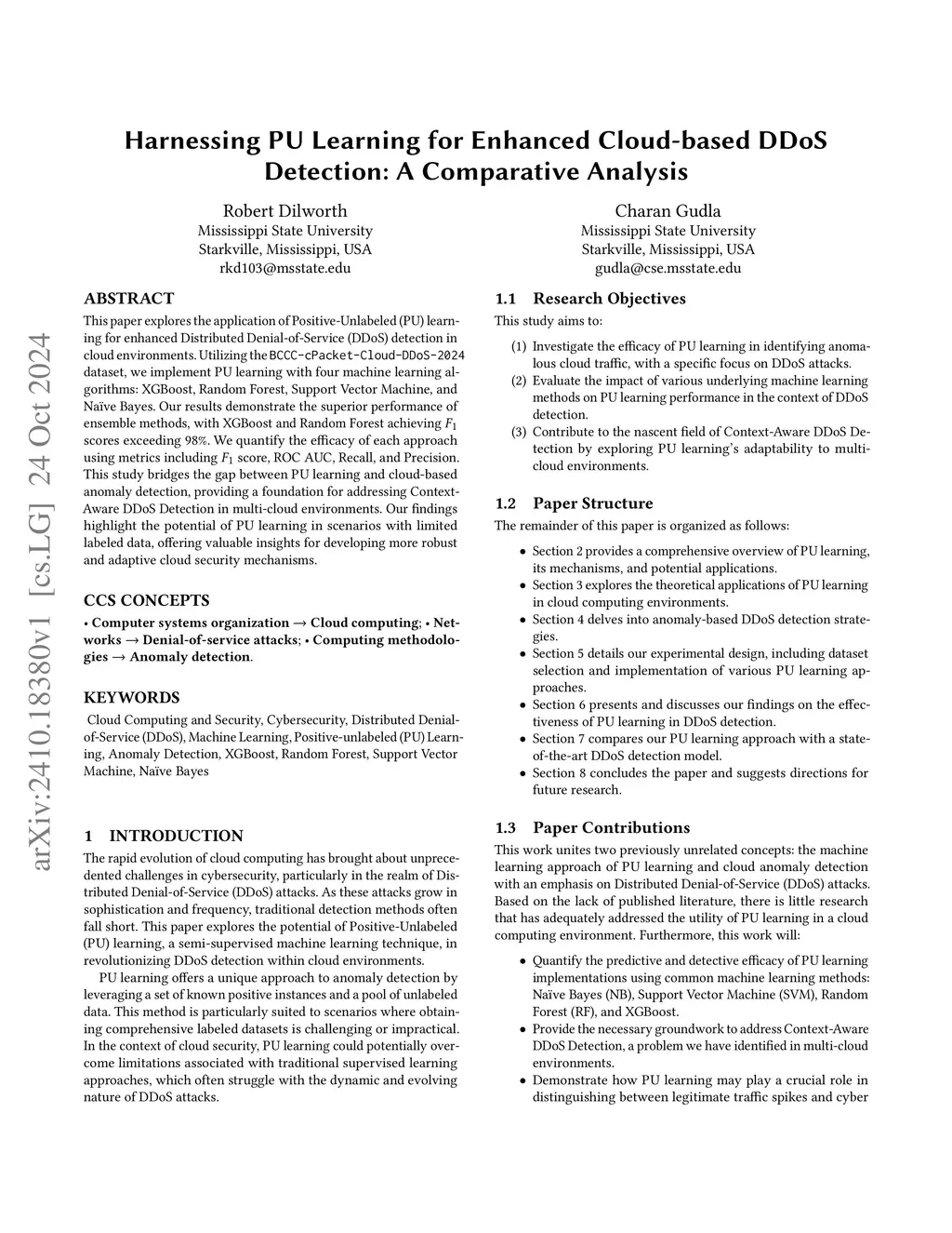 This paper explores the application of Positive-Unlabeled (PU) learning for enhanced Distributed Denial-of-Service (DDoS) detection in cloud environments. Utilizing the dataset, we implement PU learning with four machine learning algorithms: XGBoost, Random Forest, Support Vector Machine, and Na\"{i}ve Bayes. Our results demonstrate the superior performance of ensemble methods, with XGBoost and Random Forest achieving scores exceeding 98%. We quantify the efficacy of each approach using metrics including score, ROC AUC, Recall, and Precision. This study bridges the gap between PU learning and cloud-based anomaly detection, providing a foundation for addressing Context-Aware DDoS Detection in multi-cloud environments. Our findings highlight the potential of PU learning in scenarios with limited labeled data, offering valuable insights for developing more robust and adaptive cloud security mechanisms.