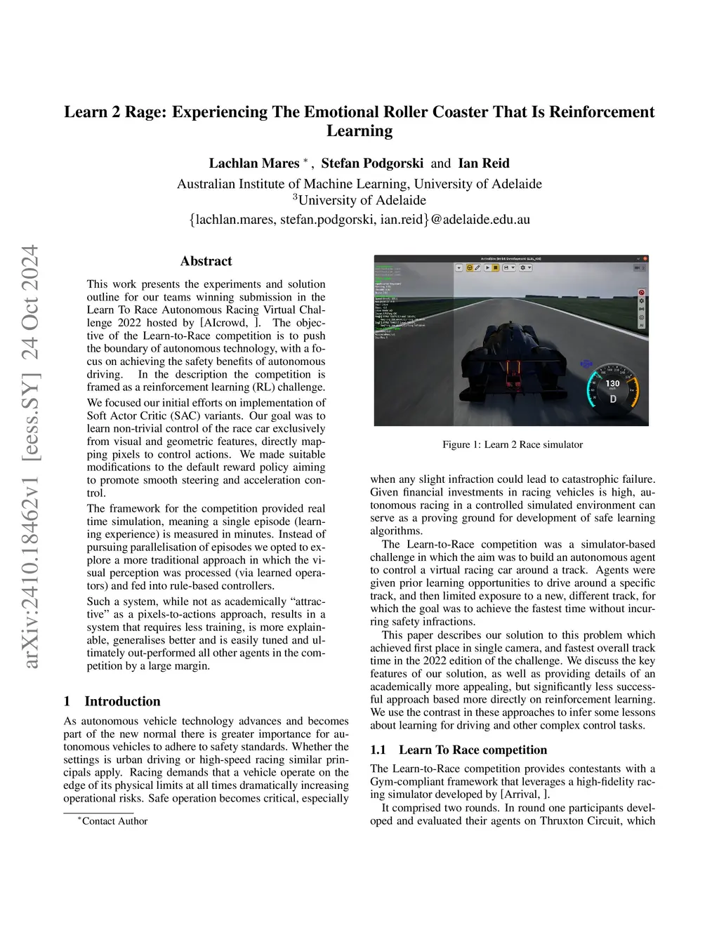 This work presents the experiments and solution outline for our teams winning submission in the Learn To Race Autonomous Racing Virtual Challenge 2022 hosted by AIcrowd. The objective of the Learn-to-Race competition is to push the boundary of autonomous technology, with a focus on achieving the safety benefits of autonomous driving. In the description the competition is framed as a reinforcement learning (RL) challenge. We focused our initial efforts on implementation of Soft Actor Critic (SAC) variants. Our goal was to learn non-trivial control of the race car exclusively from visual and geometric features, directly mapping pixels to control actions. We made suitable modifications to the default reward policy aiming to promote smooth steering and acceleration control. The framework for the competition provided real time simulation, meaning a single episode (learning experience) is measured in minutes. Instead of pursuing parallelisation of episodes we opted to explore a more traditional approach in which the visual perception was processed (via learned operators) and fed into rule-based controllers. Such a system, while not as academically "attractive" as a pixels-to-actions approach, results in a system that requires less training, is more explainable, generalises better and is easily tuned and ultimately out-performed all other agents in the competition by a large margin.