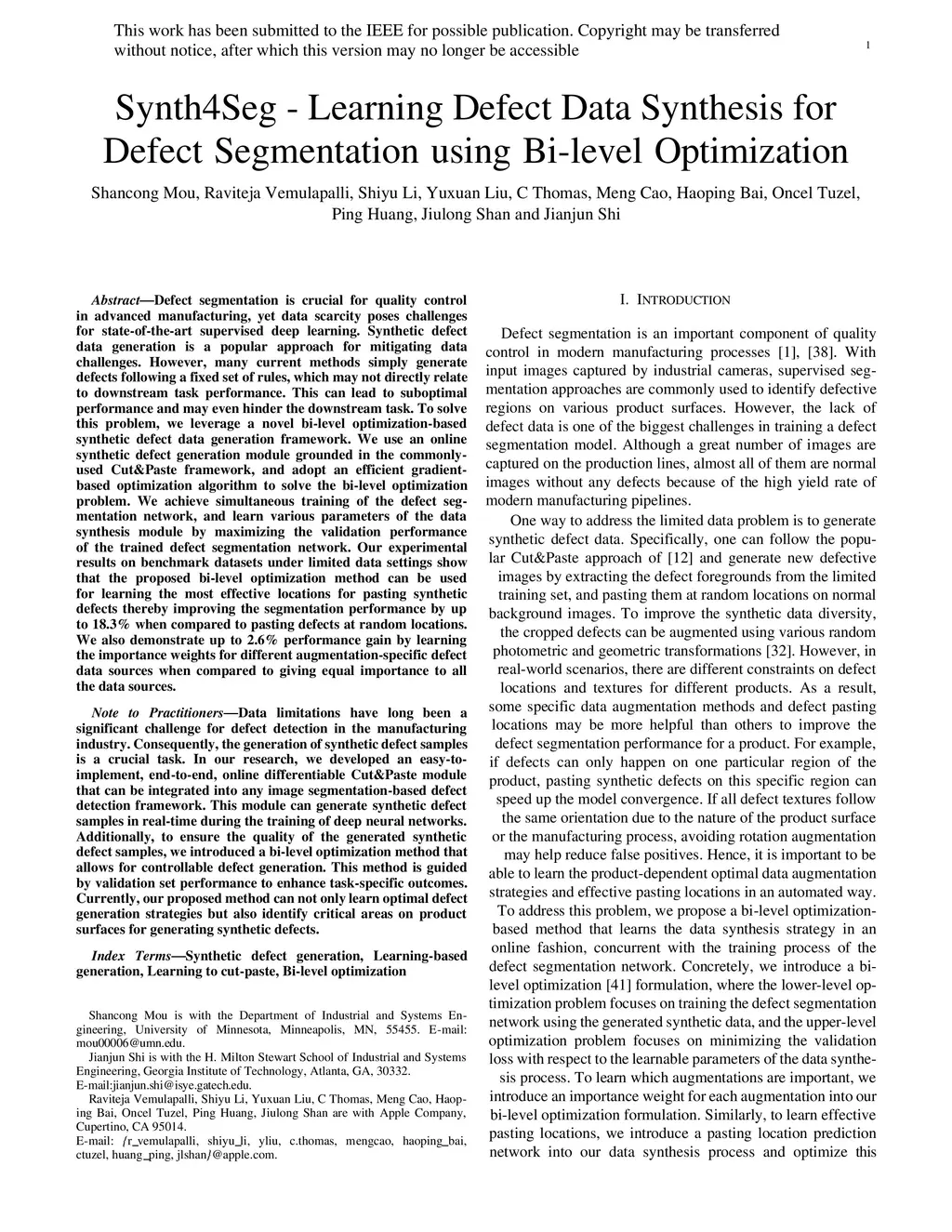 Defect segmentation is crucial for quality control in advanced manufacturing, yet data scarcity poses challenges for state-of-the-art supervised deep learning. Synthetic defect data generation is a popular approach for mitigating data challenges. However, many current methods simply generate defects following a fixed set of rules, which may not directly relate to downstream task performance. This can lead to suboptimal performance and may even hinder the downstream task. To solve this problem, we leverage a novel bi-level optimization-based synthetic defect data generation framework. We use an online synthetic defect generation module grounded in the commonly-used Cut\&Paste framework, and adopt an efficient gradient-based optimization algorithm to solve the bi-level optimization problem. We achieve simultaneous training of the defect segmentation network, and learn various parameters of the data synthesis module by maximizing the validation performance of the trained defect segmentation network. Our experimental results on benchmark datasets under limited data settings show that the proposed bi-level optimization method can be used for learning the most effective locations for pasting synthetic defects thereby improving the segmentation performance by up to 18.3\% when compared to pasting defects at random locations. We also demonstrate up to 2.6\% performance gain by learning the importance weights for different augmentation-specific defect data sources when compared to giving equal importance to all the data sources.