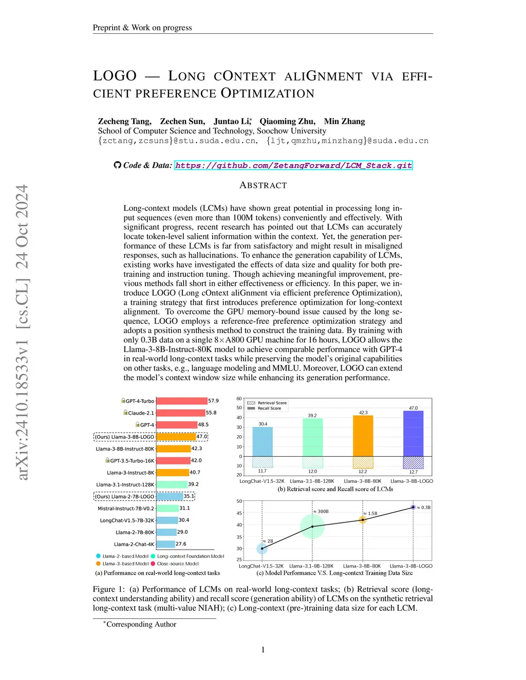 Long-context models(LCMs) have shown great potential in processing long input sequences(even more than 100M tokens) conveniently and effectively. With significant progress, recent research has pointed out that LCMs can accurately locate token-level salient information within the context. Yet, the generation performance of these LCMs is far from satisfactory and might result in misaligned responses, such as hallucinations. To enhance the generation capability of LCMs, existing works have investigated the effects of data size and quality for both pre-training and instruction tuning. Though achieving meaningful improvement, previous methods fall short in either effectiveness or efficiency. In this paper, we introduce LOGO(Long cOntext aliGnment via efficient preference Optimization), a training strategy that first introduces preference optimization for long-context alignment. To overcome the GPU memory-bound issue caused by the long sequence, LOGO employs a reference-free preference optimization strategy and adopts a position synthesis method to construct the training data. By training with only 0.3B data on a single 8A800 GPU machine for 16 hours, LOGO allows the Llama-3-8B-Instruct-80K model to achieve comparable performance with GPT-4 in real-world long-context tasks while preserving the model's original capabilities on other tasks, e.g., language modeling and MMLU. Moreover, LOGO can extend the model's context window size while enhancing its generation performance.