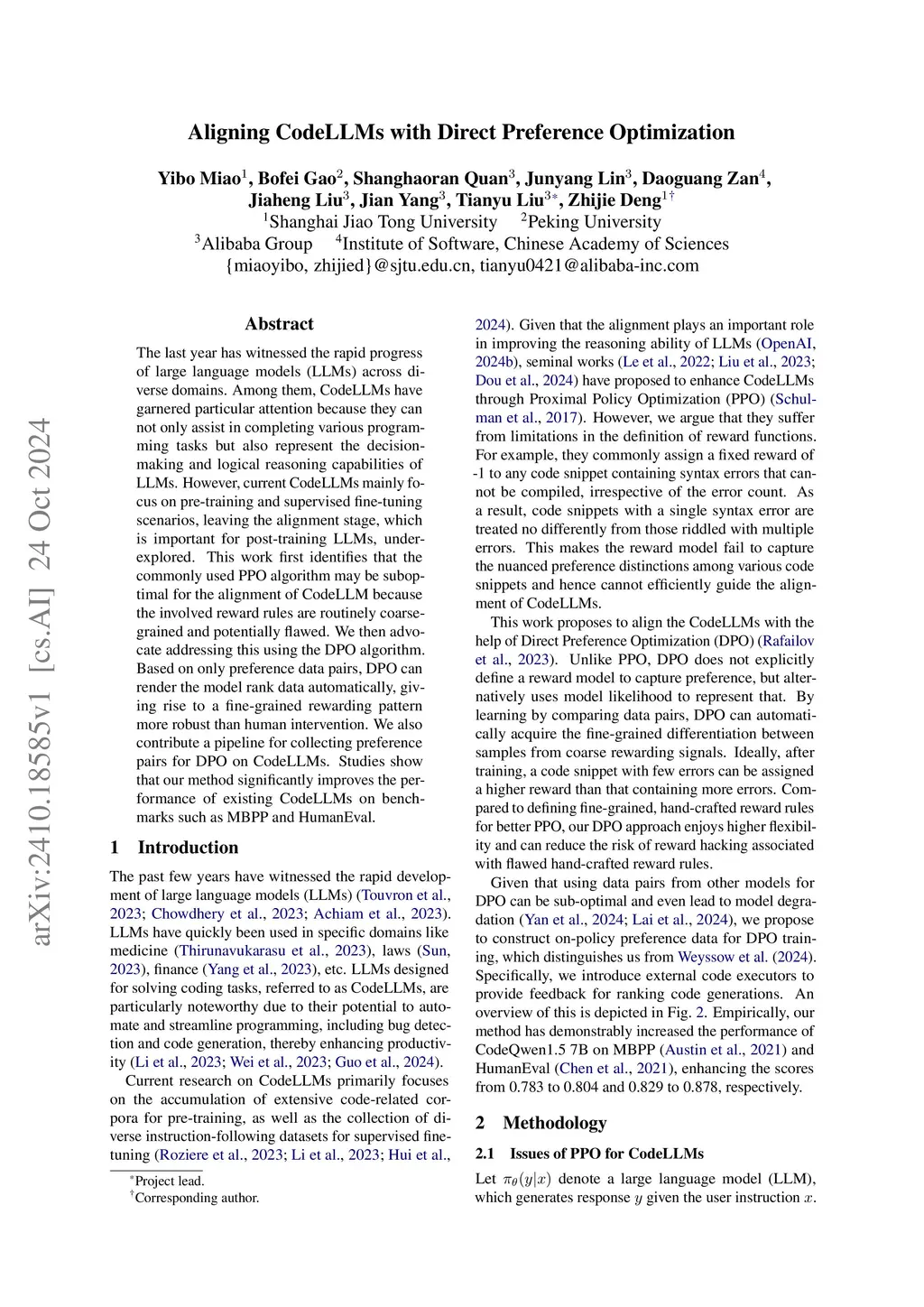 The last year has witnessed the rapid progress of large language models (LLMs) across diverse domains. Among them, CodeLLMs have garnered particular attention because they can not only assist in completing various programming tasks but also represent the decision-making and logical reasoning capabilities of LLMs. However, current CodeLLMs mainly focus on pre-training and supervised fine-tuning scenarios, leaving the alignment stage, which is important for post-training LLMs, under-explored. This work first identifies that the commonly used PPO algorithm may be suboptimal for the alignment of CodeLLM because the involved reward rules are routinely coarse-grained and potentially flawed. We then advocate addressing this using the DPO algorithm. Based on only preference data pairs, DPO can render the model rank data automatically, giving rise to a fine-grained rewarding pattern more robust than human intervention. We also contribute a pipeline for collecting preference pairs for DPO on CodeLLMs. Studies show that our method significantly improves the performance of existing CodeLLMs on benchmarks such as MBPP and HumanEval.