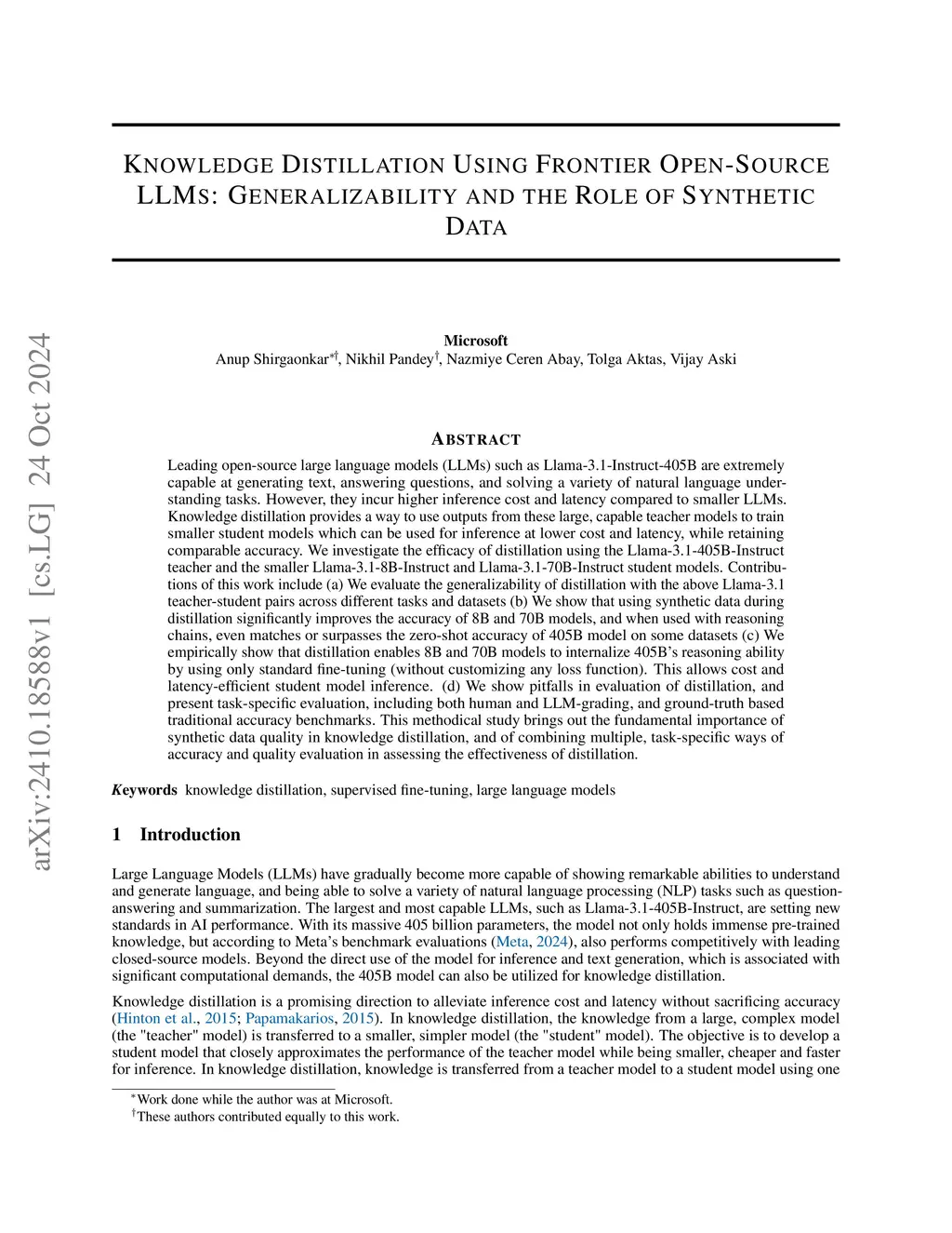 Leading open-source large language models (LLMs) such as Llama-3.1-Instruct-405B are extremely capable at generating text, answering questions, and solving a variety of natural language understanding tasks. However, they incur higher inference cost and latency compared to smaller LLMs. Knowledge distillation provides a way to use outputs from these large, capable teacher models to train smaller student models which can be used for inference at lower cost and latency, while retaining comparable accuracy. We investigate the efficacy of distillation using the Llama-3.1-405B-Instruct teacher and the smaller Llama-3.1-8B-Instruct and Llama-3.1-70B-Instruct student models. Contributions of this work include (a) We evaluate the generalizability of distillation with the above Llama-3.1 teacher-student pairs across different tasks and datasets (b) We show that using synthetic data during distillation significantly improves the accuracy of 8B and 70B models, and when used with reasoning chains, even matches or surpasses the zero-shot accuracy of 405B model on some datasets (c) We empirically show that distillation enables 8B and 70B models to internalize 405B's reasoning ability by using only standard fine-tuning (without customizing any loss function). This allows cost and latency-efficient student model inference. (d) We show pitfalls in evaluation of distillation, and present task-specific evaluation, including both human and LLM-grading, and ground-truth based traditional accuracy benchmarks. This methodical study brings out the fundamental importance of synthetic data quality in knowledge distillation, and of combining multiple, task-specific ways of accuracy and quality evaluation in assessing the effectiveness of distillation.