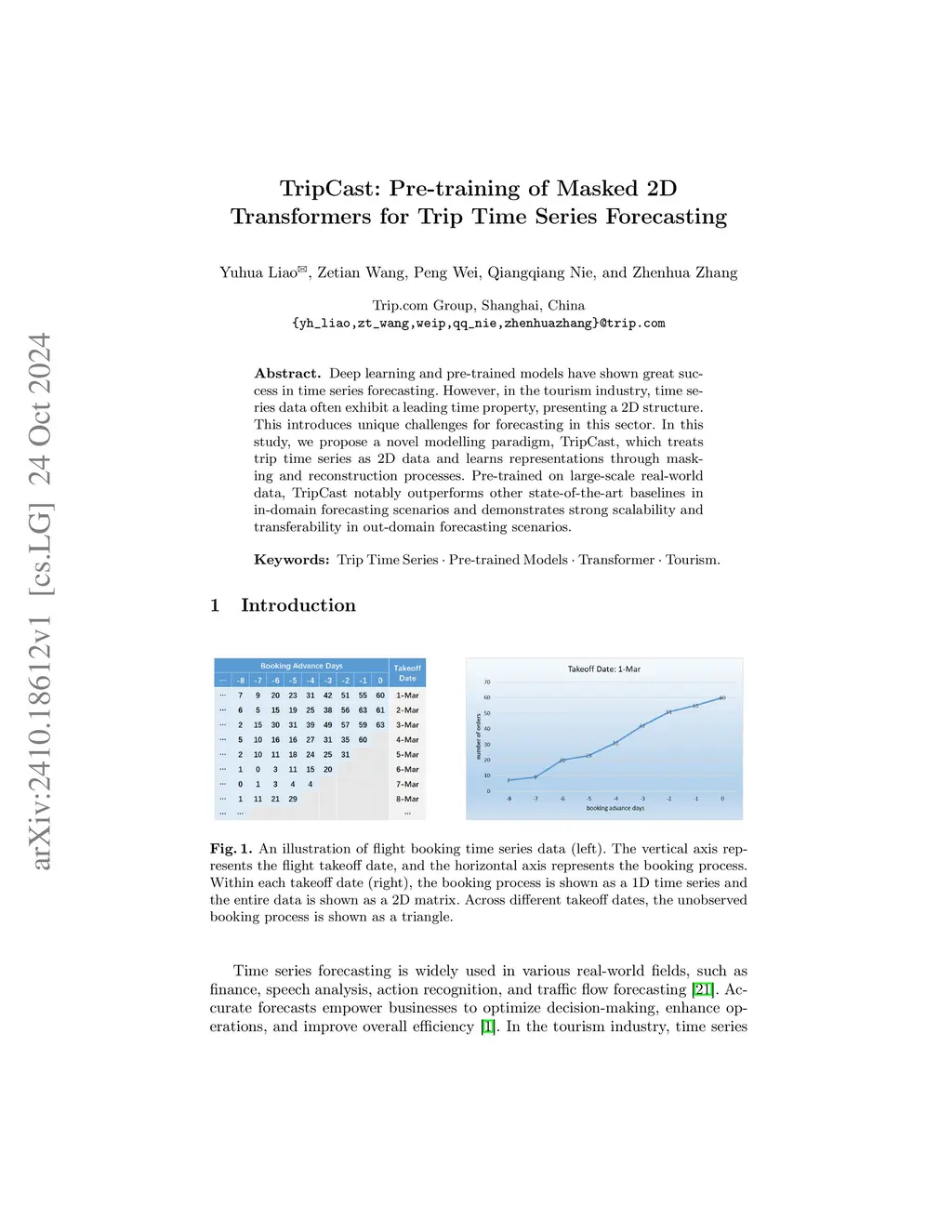 Deep learning and pre-trained models have shown great success in time series forecasting. However, in the tourism industry, time series data often exhibit a leading time property, presenting a 2D structure. This introduces unique challenges for forecasting in this sector. In this study, we propose a novel modelling paradigm, TripCast, which treats trip time series as 2D data and learns representations through masking and reconstruction processes. Pre-trained on large-scale real-world data, TripCast notably outperforms other state-of-the-art baselines in in-domain forecasting scenarios and demonstrates strong scalability and transferability in out-domain forecasting scenarios.