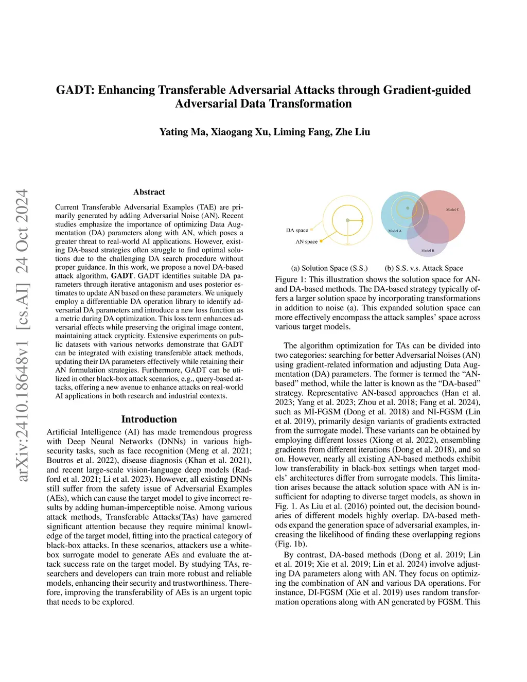 Current Transferable Adversarial Examples (TAE) are primarily generated by adding Adversarial Noise (AN). Recent studies emphasize the importance of optimizing Data Augmentation (DA) parameters along with AN, which poses a greater threat to real-world AI applications. However, existing DA-based strategies often struggle to find optimal solutions due to the challenging DA search procedure without proper guidance. In this work, we propose a novel DA-based attack algorithm, GADT. GADT identifies suitable DA parameters through iterative antagonism and uses posterior estimates to update AN based on these parameters. We uniquely employ a differentiable DA operation library to identify adversarial DA parameters and introduce a new loss function as a metric during DA optimization. This loss term enhances adversarial effects while preserving the original image content, maintaining attack crypticity. Extensive experiments on public datasets with various networks demonstrate that GADT can be integrated with existing transferable attack methods, updating their DA parameters effectively while retaining their AN formulation strategies. Furthermore, GADT can be utilized in other black-box attack scenarios, e.g., query-based attacks, offering a new avenue to enhance attacks on real-world AI applications in both research and industrial contexts.