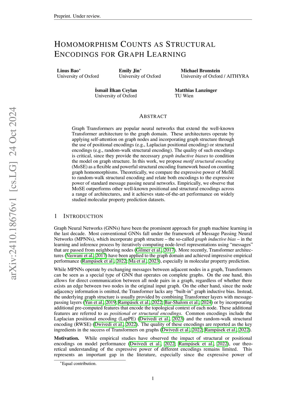 Graph Transformers are popular neural networks that extend the well-known Transformer architecture to the graph domain. These architectures operate by applying self-attention on graph nodes and incorporating graph structure through the use of positional encodings (e.g., Laplacian positional encoding) or structural encodings (e.g., random-walk structural encoding). The quality of such encodings is critical, since they provide the necessary to condition the model on graph structure. In this work, we propose (MoSE) as a flexible and powerful structural encoding framework based on counting graph homomorphisms. Theoretically, we compare the expressive power of MoSE to random-walk structural encoding and relate both encodings to the expressive power of standard message passing neural networks. Empirically, we observe that MoSE outperforms other well-known positional and structural encodings across a range of architectures, and it achieves state-of-the-art performance on a widely studied molecular property prediction dataset.