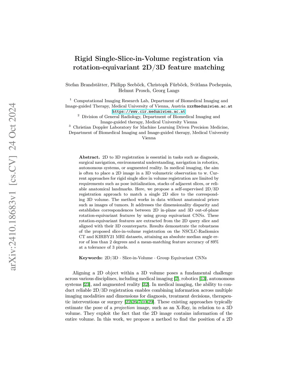 2D to 3D registration is essential in tasks such as diagnosis, surgical navigation, environmental understanding, navigation in robotics, autonomous systems, or augmented reality. In medical imaging, the aim is often to place a 2D image in a 3D volumetric observation to w. Current approaches for rigid single slice in volume registration are limited by requirements such as pose initialization, stacks of adjacent slices, or reliable anatomical landmarks. Here, we propose a self-supervised 2D/3D registration approach to match a single 2D slice to the corresponding 3D volume. The method works in data without anatomical priors such as images of tumors. It addresses the dimensionality disparity and establishes correspondences between 2D in-plane and 3D out-of-plane rotation-equivariant features by using group equivariant CNNs. These rotation-equivariant features are extracted from the 2D query slice and aligned with their 3D counterparts. Results demonstrate the robustness of the proposed slice-in-volume registration on the NSCLC-Radiomics CT and KIRBY21 MRI datasets, attaining an absolute median angle error of less than 2 degrees and a mean-matching feature accuracy of 89% at a tolerance of 3 pixels.