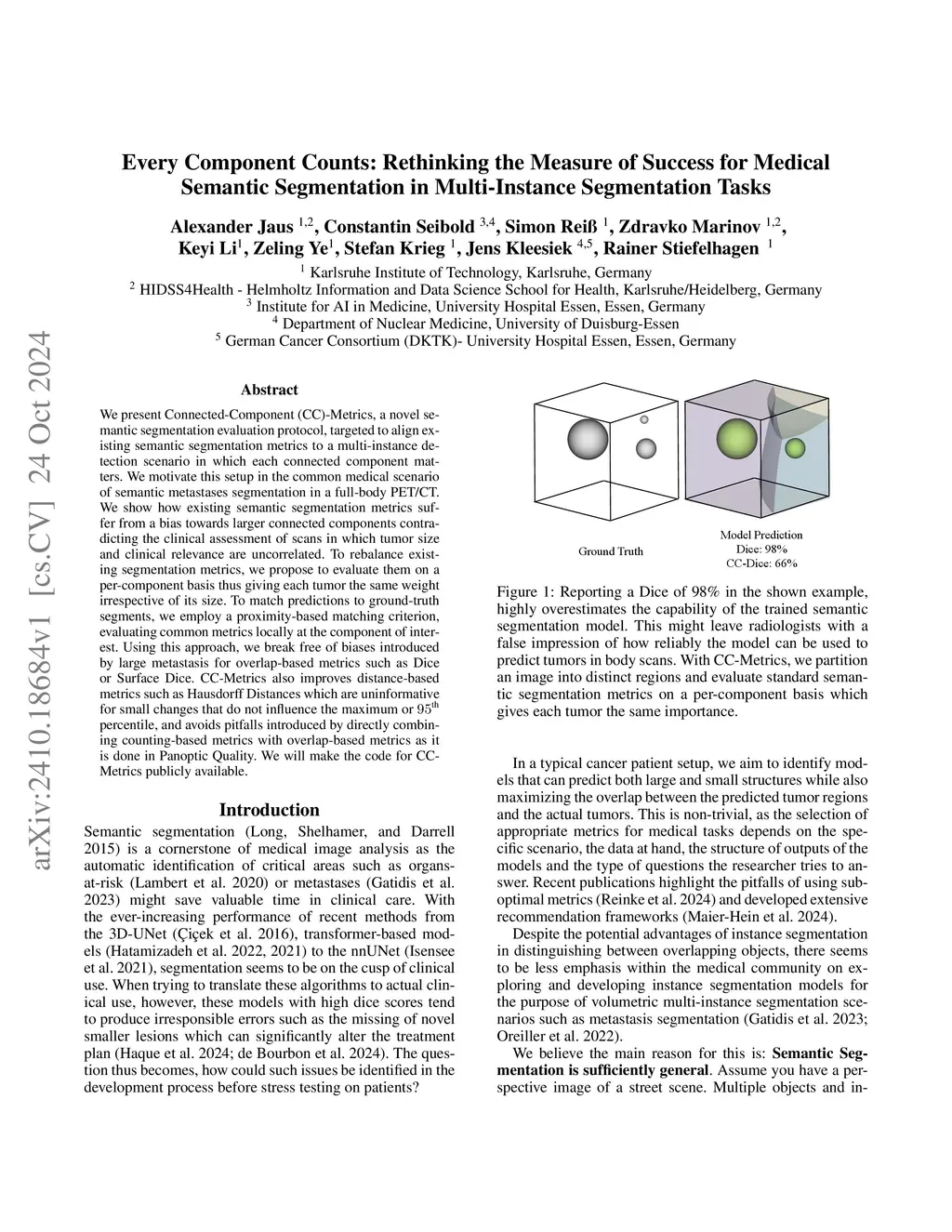 We present Connected-Component~(CC)-Metrics, a novel semantic segmentation evaluation protocol, targeted to align existing semantic segmentation metrics to a multi-instance detection scenario in which each connected component matters. We motivate this setup in the common medical scenario of semantic metastases segmentation in a full-body PET/CT. We show how existing semantic segmentation metrics suffer from a bias towards larger connected components contradicting the clinical assessment of scans in which tumor size and clinical relevance are uncorrelated. To rebalance existing segmentation metrics, we propose to evaluate them on a per-component basis thus giving each tumor the same weight irrespective of its size. To match predictions to ground-truth segments, we employ a proximity-based matching criterion, evaluating common metrics locally at the component of interest. Using this approach, we break free of biases introduced by large metastasis for overlap-based metrics such as Dice or Surface Dice. CC-Metrics also improves distance-based metrics such as Hausdorff Distances which are uninformative for small changes that do not influence the maximum or 95th percentile, and avoids pitfalls introduced by directly combining counting-based metrics with overlap-based metrics as it is done in Panoptic Quality.