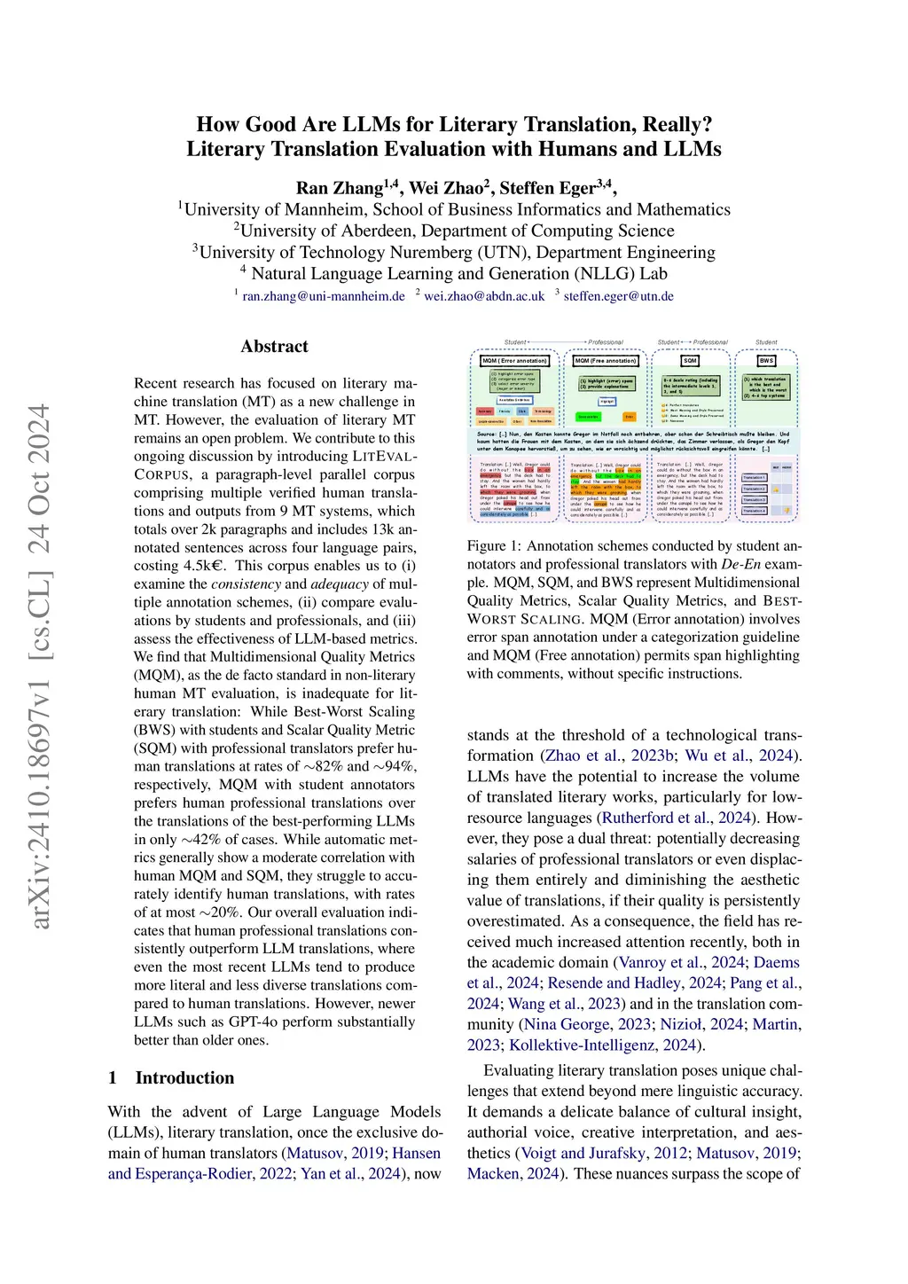 Recent research has focused on literary machine translation (MT) as a new challenge in MT. However, the evaluation of literary MT remains an open problem. We contribute to this ongoing discussion by introducing LITEVAL-CORPUS, a paragraph-level parallel corpus containing verified human translations and outputs from 9 MT systems, which totals over 2k translations and 13k evaluated sentences across four language pairs, costing 4.5k C. This corpus enables us to (i) examine the consistency and adequacy of human evaluation schemes with various degrees of complexity, (ii) compare evaluations by students and professionals, assess the effectiveness of (iii) LLM-based metrics and (iv) LLMs themselves. Our findings indicate that the adequacy of human evaluation is controlled by two factors: the complexity of the evaluation scheme (more complex is less adequate) and the expertise of evaluators (higher expertise yields more adequate evaluations). For instance, MQM (Multidimensional Quality Metrics), a complex scheme and the de facto standard for non-literary human MT evaluation, is largely inadequate for literary translation evaluation: with student evaluators, nearly 60% of human translations are misjudged as indistinguishable or inferior to machine translations. In contrast, BWS (BEST-WORST SCALING), a much simpler scheme, identifies human translations at a rate of 80-100%. Automatic metrics fare dramatically worse, with rates of at most 20%. Our overall evaluation indicates that published human translations consistently outperform LLM translations, where even the most recent LLMs tend to produce considerably more literal and less diverse translations compared to humans.