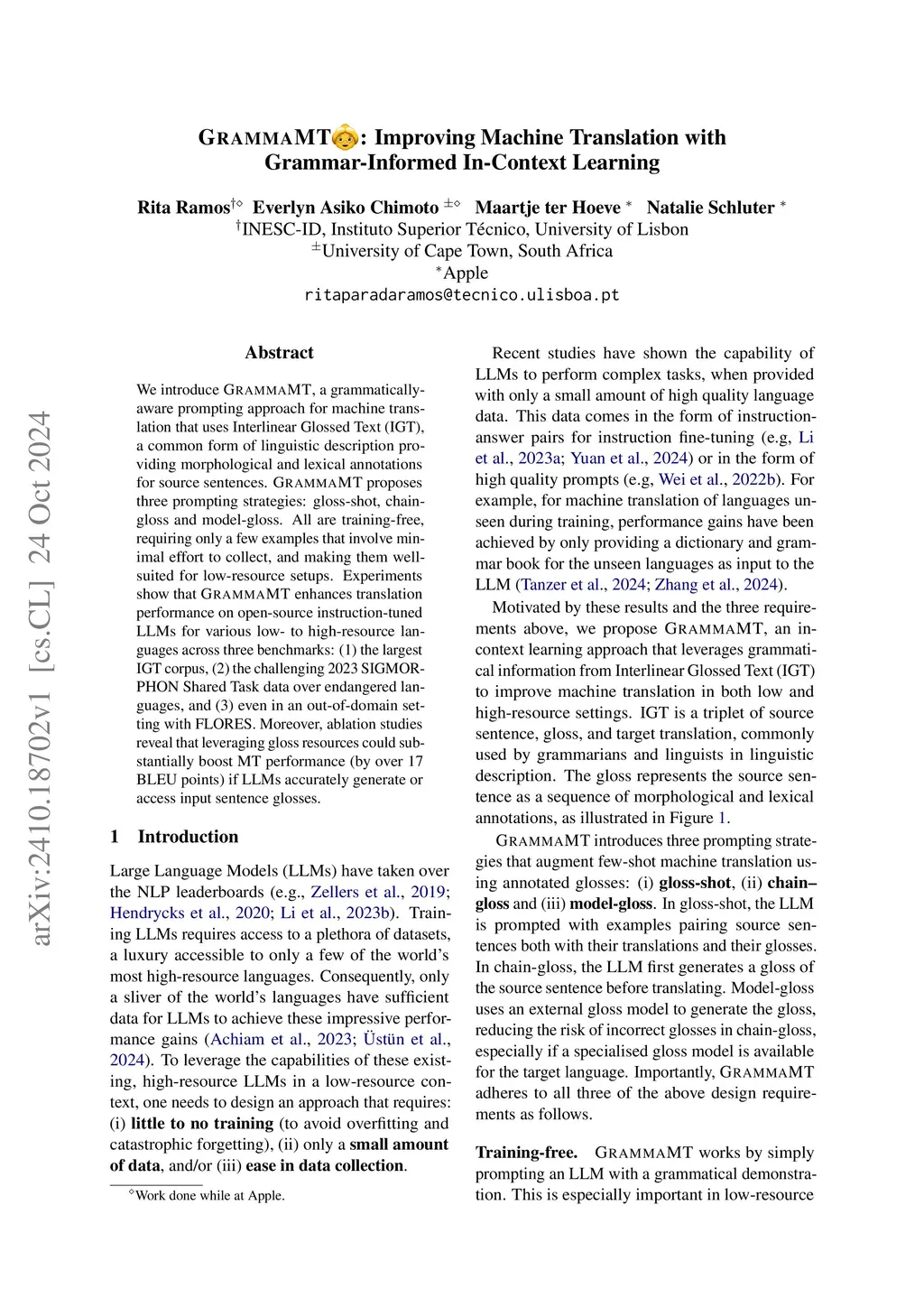 We introduce GrammaMT, a grammatically-aware prompting approach for machine translation that uses Interlinear Glossed Text (IGT), a common form of linguistic description providing morphological and lexical annotations for source sentences. GrammaMT proposes three prompting strategies: gloss-shot, chain-gloss and model-gloss. All are training-free, requiring only a few examples that involve minimal effort to collect, and making them well-suited for low-resource setups. Experiments show that GrammaMT enhances translation performance on open-source instruction-tuned LLMs for various low- to high-resource languages across three benchmarks: (1) the largest IGT corpus, (2) the challenging 2023 SIGMORPHON Shared Task data over endangered languages, and (3) even in an out-of-domain setting with FLORES. Moreover, ablation studies reveal that leveraging gloss resources could substantially boost MT performance (by over 17 BLEU points) if LLMs accurately generate or access input sentence glosses.