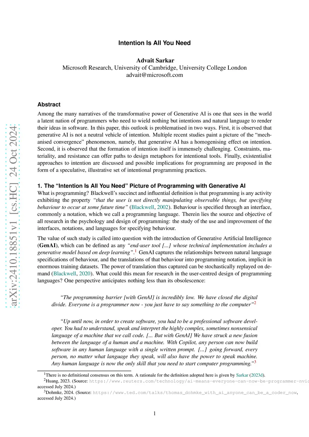 Among the many narratives of the transformative power of Generative AI is one that sees in the world a latent nation of programmers who need to wield nothing but intentions and natural language to render their ideas in software. In this paper, this outlook is problematised in two ways. First, it is observed that generative AI is not a neutral vehicle of intention. Multiple recent studies paint a picture of the "mechanised convergence" phenomenon, namely, that generative AI has a homogenising effect on intention. Second, it is observed that the formation of intention itself is immensely challenging. Constraints, materiality, and resistance can offer paths to design metaphors for intentional tools. Finally, existentialist approaches to intention are discussed and possible implications for programming are proposed in the form of a speculative, illustrative set of intentional programming practices.