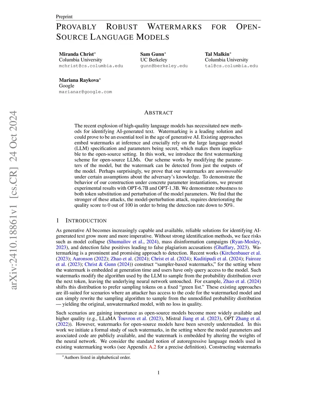 The recent explosion of high-quality language models has necessitated new methods for identifying AI-generated text. Watermarking is a leading solution and could prove to be an essential tool in the age of generative AI. Existing approaches embed watermarks at inference and crucially rely on the large language model (LLM) specification and parameters being secret, which makes them inapplicable to the open-source setting. In this work, we introduce the first watermarking scheme for open-source LLMs. Our scheme works by modifying the parameters of the model, but the watermark can be detected from just the outputs of the model. Perhaps surprisingly, we prove that our watermarks are unremovable under certain assumptions about the adversary's knowledge. To demonstrate the behavior of our construction under concrete parameter instantiations, we present experimental results with OPT-6.7B and OPT-1.3B. We demonstrate robustness to both token substitution and perturbation of the model parameters. We find that the stronger of these attacks, the model-perturbation attack, requires deteriorating the quality score to 0 out of 100 in order to bring the detection rate down to 50%.