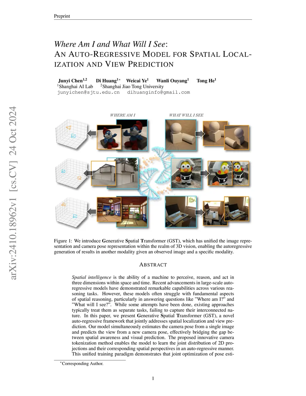 Spatial intelligence is the ability of a machine to perceive, reason, and act in three dimensions within space and time. Recent advancements in large-scale auto-regressive models have demonstrated remarkable capabilities across various reasoning tasks. However, these models often struggle with fundamental aspects of spatial reasoning, particularly in answering questions like "Where am I?" and "What will I see?". While some attempts have been done, existing approaches typically treat them as separate tasks, failing to capture their interconnected nature. In this paper, we present Generative Spatial Transformer (GST), a novel auto-regressive framework that jointly addresses spatial localization and view prediction. Our model simultaneously estimates the camera pose from a single image and predicts the view from a new camera pose, effectively bridging the gap between spatial awareness and visual prediction. The proposed innovative camera tokenization method enables the model to learn the joint distribution of 2D projections and their corresponding spatial perspectives in an auto-regressive manner. This unified training paradigm demonstrates that joint optimization of pose estimation and novel view synthesis leads to improved performance in both tasks, for the first time, highlighting the inherent relationship between spatial awareness and visual prediction.