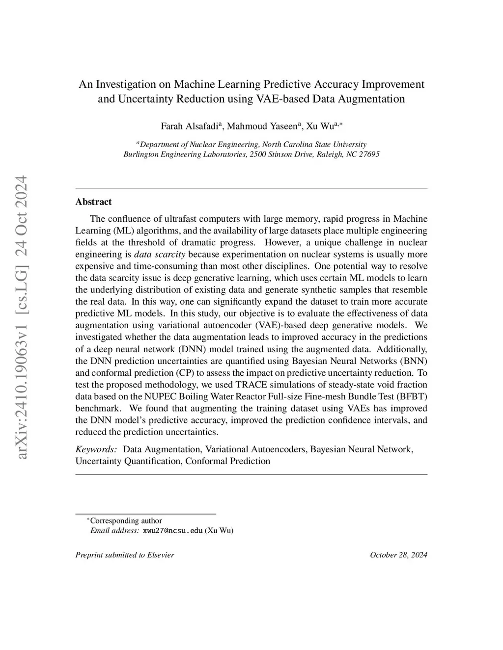 The confluence of ultrafast computers with large memory, rapid progress in Machine Learning (ML) algorithms, and the availability of large datasets place multiple engineering fields at the threshold of dramatic progress. However, a unique challenge in nuclear engineering is data scarcity because experimentation on nuclear systems is usually more expensive and time-consuming than most other disciplines. One potential way to resolve the data scarcity issue is deep generative learning, which uses certain ML models to learn the underlying distribution of existing data and generate synthetic samples that resemble the real data. In this way, one can significantly expand the dataset to train more accurate predictive ML models. In this study, our objective is to evaluate the effectiveness of data augmentation using variational autoencoder (VAE)-based deep generative models. We investigated whether the data augmentation leads to improved accuracy in the predictions of a deep neural network (DNN) model trained using the augmented data. Additionally, the DNN prediction uncertainties are quantified using Bayesian Neural Networks (BNN) and conformal prediction (CP) to assess the impact on predictive uncertainty reduction. To test the proposed methodology, we used TRACE simulations of steady-state void fraction data based on the NUPEC Boiling Water Reactor Full-size Fine-mesh Bundle Test (BFBT) benchmark. We found that augmenting the training dataset using VAEs has improved the DNN model's predictive accuracy, improved the prediction confidence intervals, and reduced the prediction uncertainties.