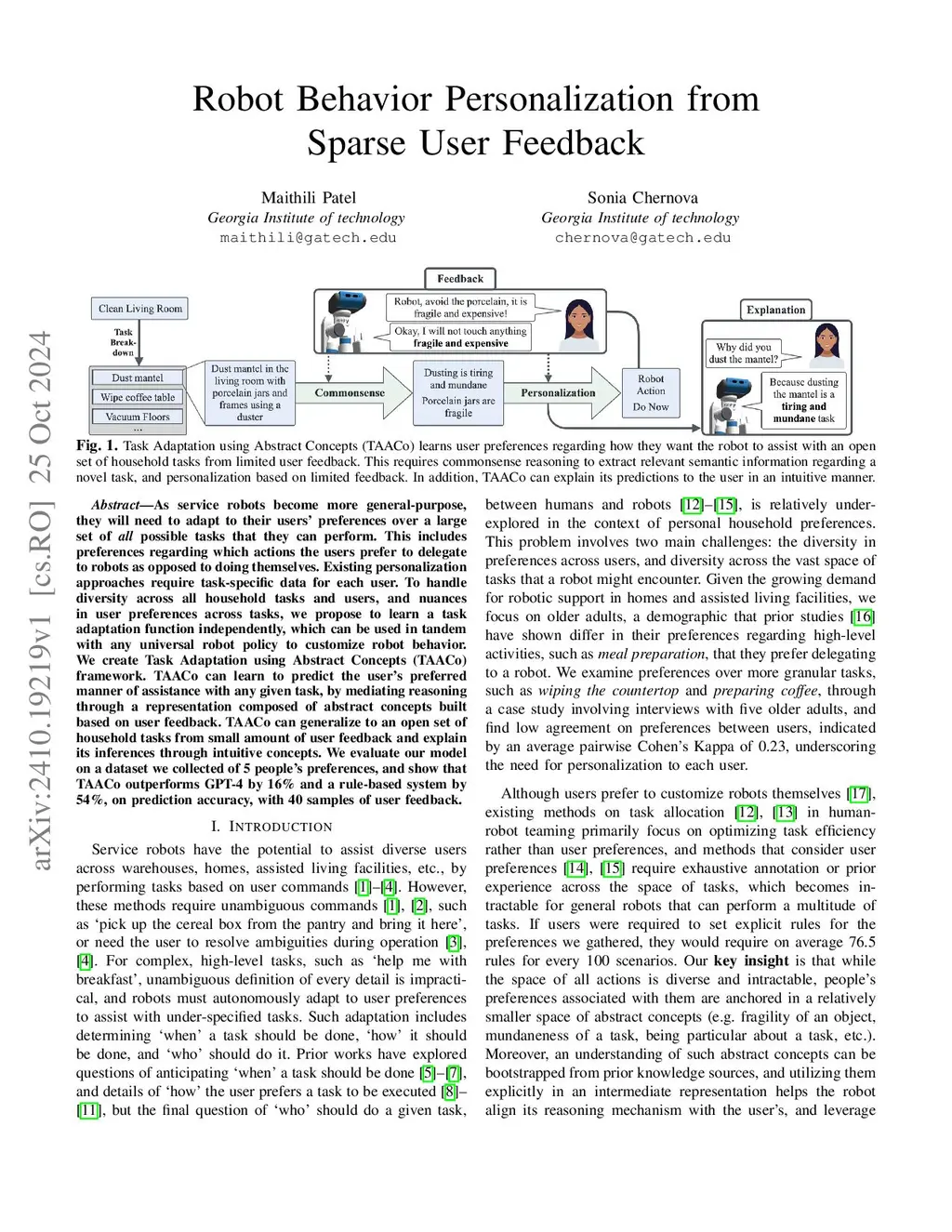 As service robots become more general-purpose, they will need to adapt to their users' preferences over a large set of all possible tasks that they can perform. This includes preferences regarding which actions the users prefer to delegate to robots as opposed to doing themselves. Existing personalization approaches require task-specific data for each user. To handle diversity across all household tasks and users, and nuances in user preferences across tasks, we propose to learn a task adaptation function independently, which can be used in tandem with any universal robot policy to customize robot behavior. We create Task Adaptation using Abstract Concepts (TAACo) framework. TAACo can learn to predict the user's preferred manner of assistance with any given task, by mediating reasoning through a representation composed of abstract concepts built based on user feedback. TAACo can generalize to an open set of household tasks from small amount of user feedback and explain its inferences through intuitive concepts. We evaluate our model on a dataset we collected of 5 people's preferences, and show that TAACo outperforms GPT-4 by 16% and a rule-based system by 54%, on prediction accuracy, with 40 samples of user feedback.