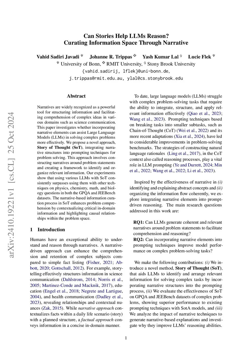 Narratives are widely recognized as a powerful tool for structuring information and facilitating comprehension of complex ideas in various domains such as science communication. This paper investigates whether incorporating narrative elements can assist Large Language Models (LLMs) in solving complex problems more effectively. We propose a novel approach, Story of Thought (SoT), integrating narrative structures into prompting techniques for problem-solving. This approach involves constructing narratives around problem statements and creating a framework to identify and organize relevant information. Our experiments show that using various LLMs with SoT consistently surpasses using them with other techniques on physics, chemistry, math, and biology questions in both the GPQA and JEEBench datasets. The narrative-based information curation process in SoT enhances problem comprehension by contextualizing critical in-domain information and highlighting causal relationships within the problem space.