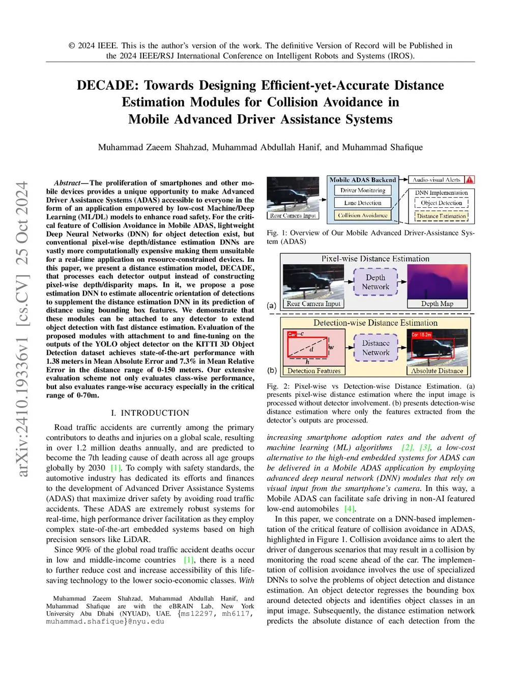 The proliferation of smartphones and other mobile devices provides a unique opportunity to make Advanced Driver Assistance Systems (ADAS) accessible to everyone in the form of an application empowered by low-cost Machine/Deep Learning (ML/DL) models to enhance road safety. For the critical feature of Collision Avoidance in Mobile ADAS, lightweight Deep Neural Networks (DNN) for object detection exist, but conventional pixel-wise depth/distance estimation DNNs are vastly more computationally expensive making them unsuitable for a real-time application on resource-constrained devices. In this paper, we present a distance estimation model, DECADE, that processes each detector output instead of constructing pixel-wise depth/disparity maps. In it, we propose a pose estimation DNN to estimate allocentric orientation of detections to supplement the distance estimation DNN in its prediction of distance using bounding box features. We demonstrate that these modules can be attached to any detector to extend object detection with fast distance estimation. Evaluation of the proposed modules with attachment to and fine-tuning on the outputs of the YOLO object detector on the KITTI 3D Object Detection dataset achieves state-of-the-art performance with 1.38 meters in Mean Absolute Error and 7.3% in Mean Relative Error in the distance range of 0-150 meters. Our extensive evaluation scheme not only evaluates class-wise performance, but also evaluates range-wise accuracy especially in the critical range of 0-70m.
