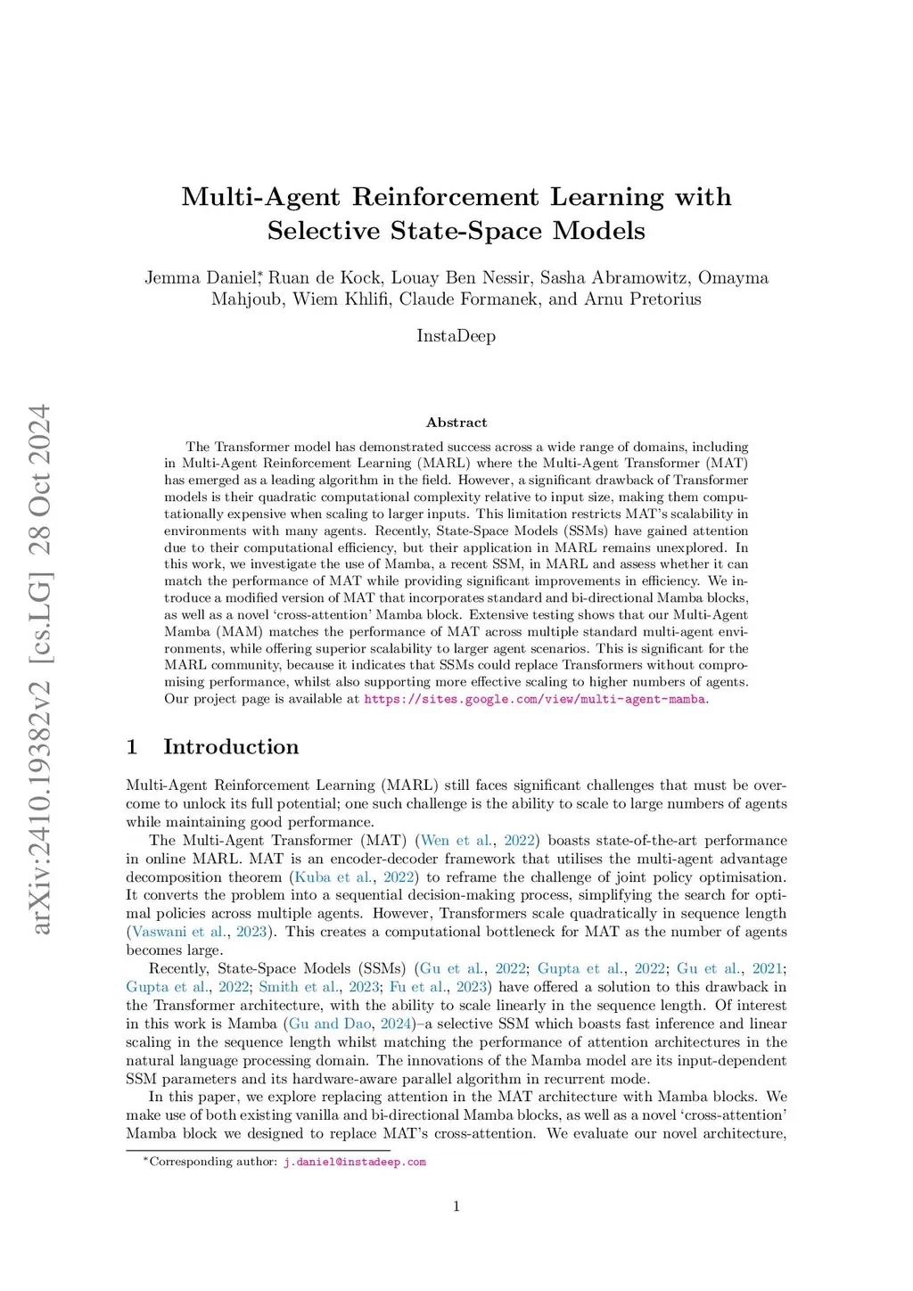 The Transformer model has demonstrated success across a wide range of domains, including in Multi-Agent Reinforcement Learning (MARL) where the Multi-Agent Transformer (MAT) has emerged as a leading algorithm in the field. However, a significant drawback of Transformer models is their quadratic computational complexity relative to input size, making them computationally expensive when scaling to larger inputs. This limitation restricts MAT's scalability in environments with many agents. Recently, State-Space Models (SSMs) have gained attention due to their computational efficiency, but their application in MARL remains unexplored. In this work, we investigate the use of Mamba, a recent SSM, in MARL and assess whether it can match the performance of MAT while providing significant improvements in efficiency. We introduce a modified version of MAT that incorporates standard and bi-directional Mamba blocks, as well as a novel "cross-attention" Mamba block. Extensive testing shows that our Multi-Agent Mamba (MAM) matches the performance of MAT across multiple standard multi-agent environments, while offering superior scalability to larger agent scenarios. This is significant for the MARL community, because it indicates that SSMs could replace Transformers without compromising performance, whilst also supporting more effective scaling to higher numbers of agents. Our project page is available at https://sites.google.com/view/multi-agent-mamba .